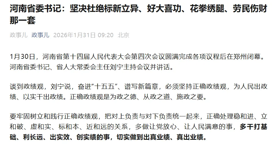 河南的刘总工刚刚在两会上着重强调,要坚决杜绝标新立异、好大喜功、花拳绣腿、劳民伤财那一套,引发了广泛的关注,说明河南更加注重务实。