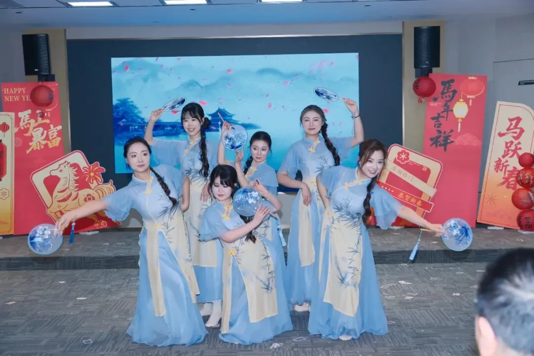 牛一帆、李艳艳、王丽君、何曼茹、冯琪、陈馨以轻盈身姿勾勒出水墨青花的古典意境,为本次联欢会画上完美句号。