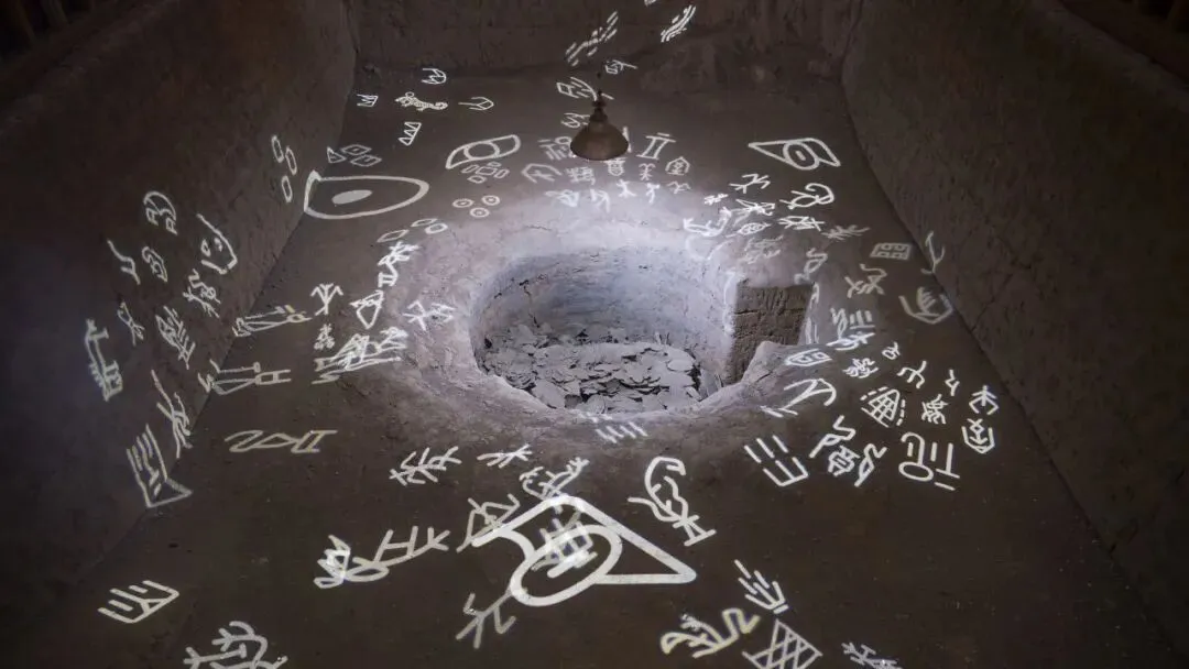 YH127甲骨窖穴,坑中甲骨及人骨为复原景象。