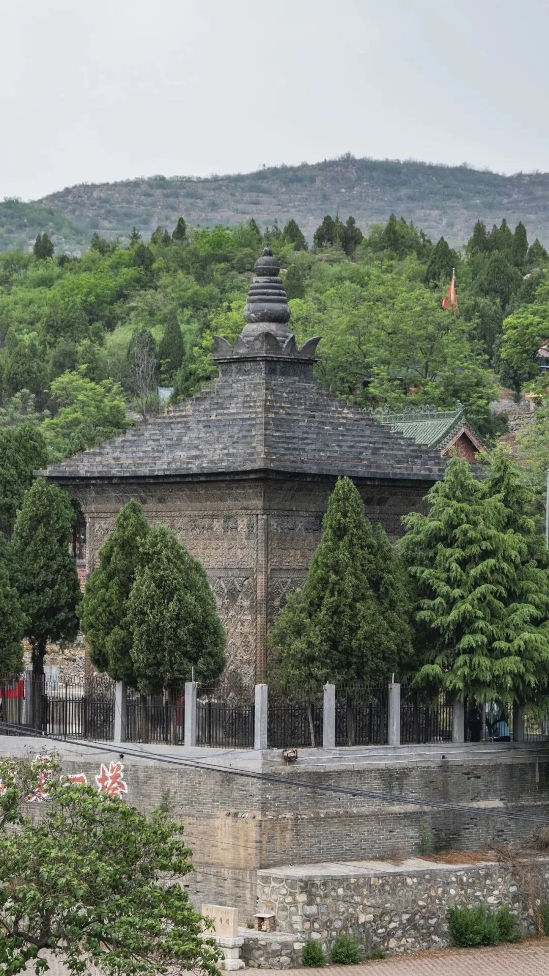 修定寺塔位于安阳市西北清凉山中,为单层方型浮雕砖舍利塔,始建于北齐天保年间,后又有增建修缮,但断代不晚于唐。全塔通体镶嵌菱形、三角形等形状的模制琉璃浮雕花砖共3775块,因而在近代招来了不少专门从事盗卖的文物贩子,至今仍有多块雕砖流失海外,当地民众不得不以白泥灰覆盖塔身,虽然延缓了文物的流失,却错失了在新中国第一次评定全国重点文物保护单位时入选的机会。所幸在上世纪七十年代修定寺塔得到修复,发现北齐天宝五年(553年)文宣帝、王母太妃等到修定寺拜佛供养的铭文,成为建造断代的重要依据,并在1982年位列第二批国保古建筑及历史纪念建筑物中的1号。修定寺塔塔身砖雕纹样近百种,取材涵盖佛教形象、四方神、花纹、胡人伎乐等。方形塔身形制来源于佛教中的宝帐,因而又可细分为帐头(塔檐)、帐楣、帘幕、立柱几部分,其上的塔顶与塔刹为上世纪八十年代参照灵泉寺石窟塔所重建,似与传世记载和早期照片不甚相符。修定寺塔对面山坡有座观音堂,从那里再看修定寺塔,颇有一种遗世独立之感。