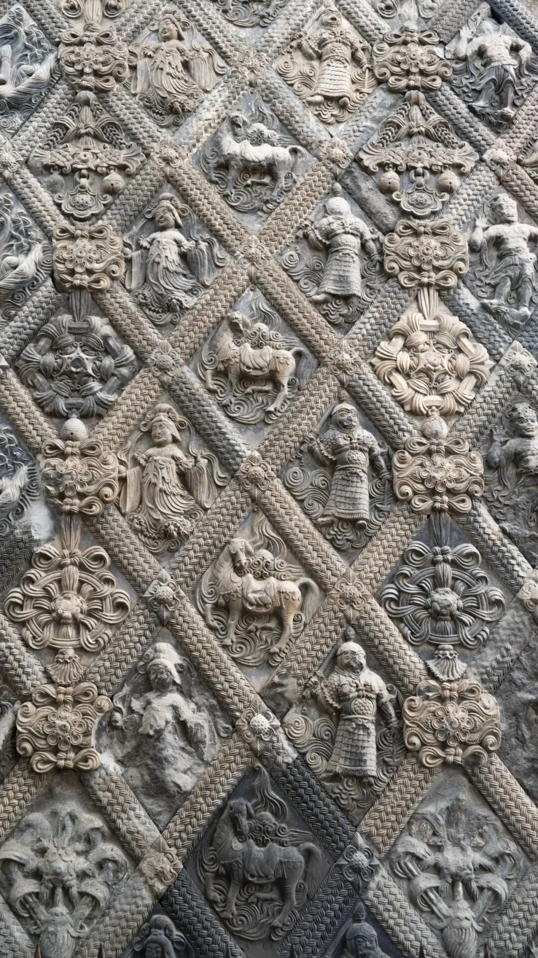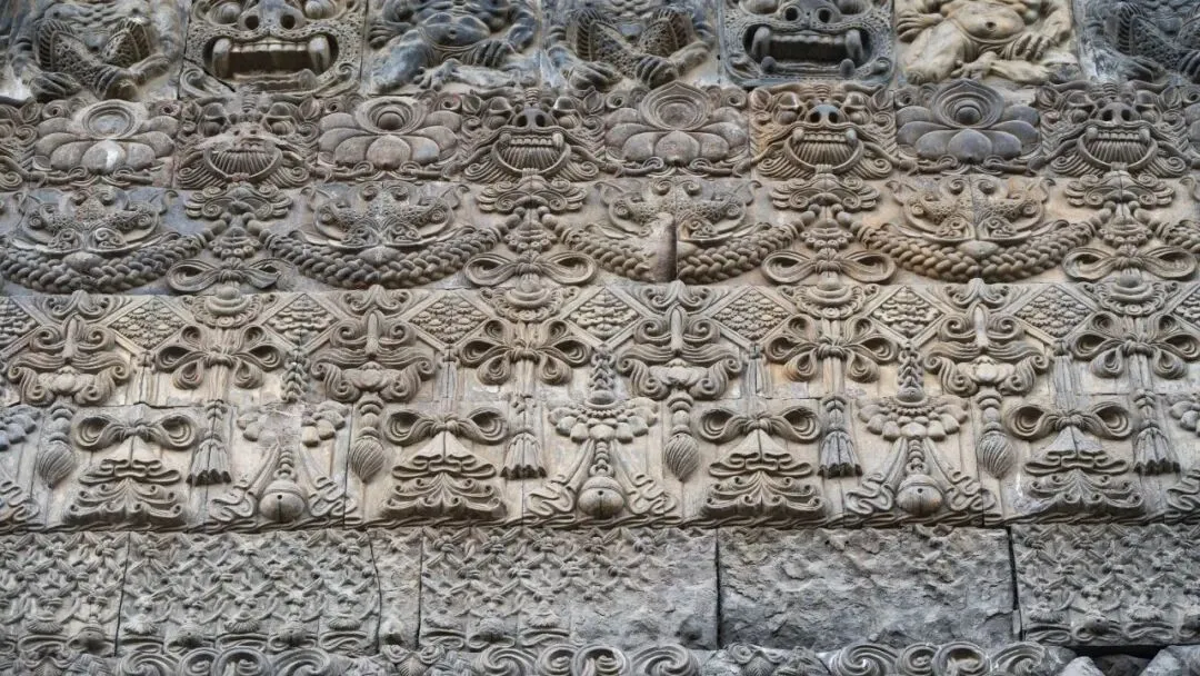 帘幕部分,深色砖为后期补贴,由于修定寺塔大部分帘幕花砖为榫卯结构,盗卖者取一块砖时需要敲开周围四块砖,造成很大损失。