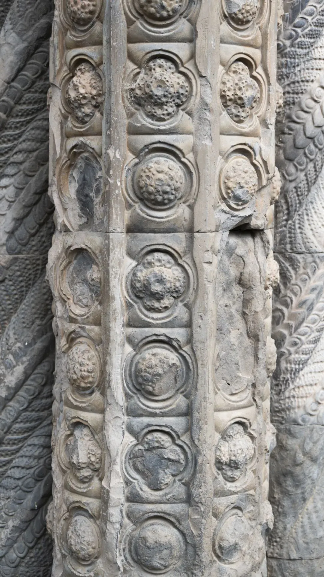 立柱部分,砖块多为嵌入式,同时还是帘幕部分菱形砖榫卯结构的支点,因此也有被破坏的现象。
