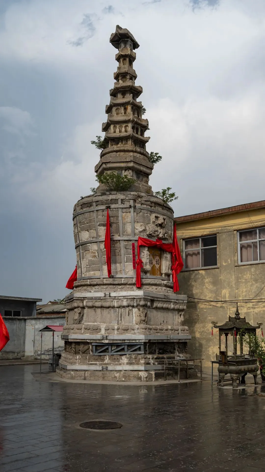 脱出博物馆时已过正午,考虑到接下来的任务最终还是意料之中地放弃了午饭直奔天宁寺塔而去。安阳天宁寺塔又称文峰塔,始建于五代后周广顺二年(952年),是安阳老城的标志性建筑,以至于下了公交还没看到本体就先在电缆井盖上一睹尊容。天宁寺塔共五层八面,最独特的地方在于上大下小,自底层向上逐层外扩呈伞状。塔基与塔身间为七层莲花座,塔身八面均雕刻有佛教故事,其中正南面为三身佛,法身毗卢遮那佛居中端坐,应身释迦牟尼佛与报身卢舍那佛分立左右。清代修缮后,天宁寺塔塔刹被改造成了覆钵状舍利塔形式,又添一重特色。可惜的是,自去年开始天宁寺塔已不允许登塔,无疑是再一次访古要趁早的教训。