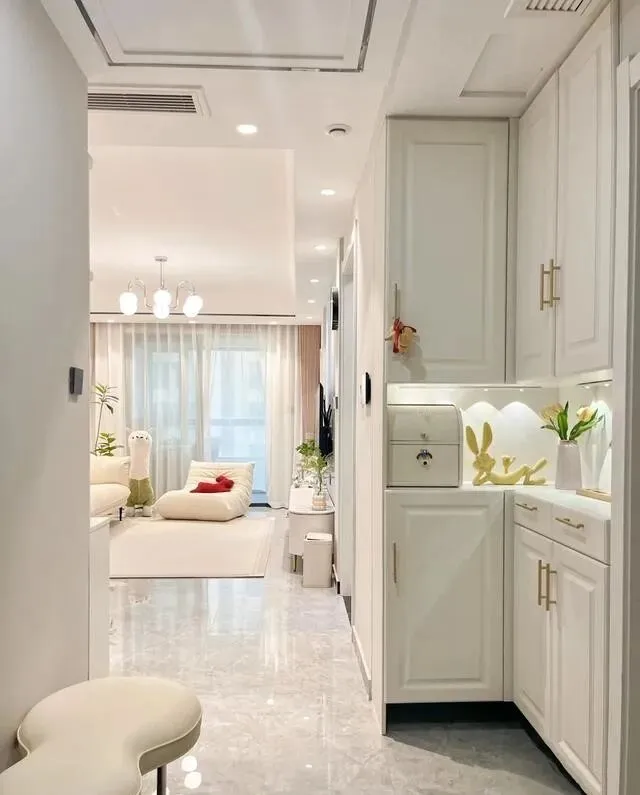 白色柜门配金色拉手 , 这个搭配我真的很喜欢 , 干净又精致 , 一点都不俗气。