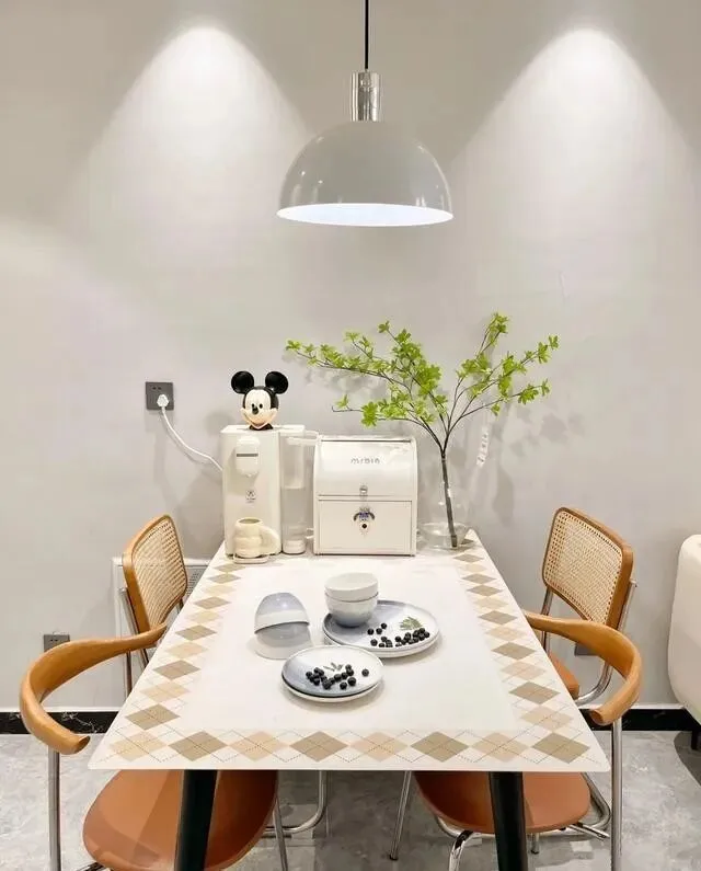 桌上铺了个跟椅子颜色接近的桌垫 , 呼应得很自然 , 头顶一盏锅盖吊灯 , 吃饭的时候氛围感直接到位。