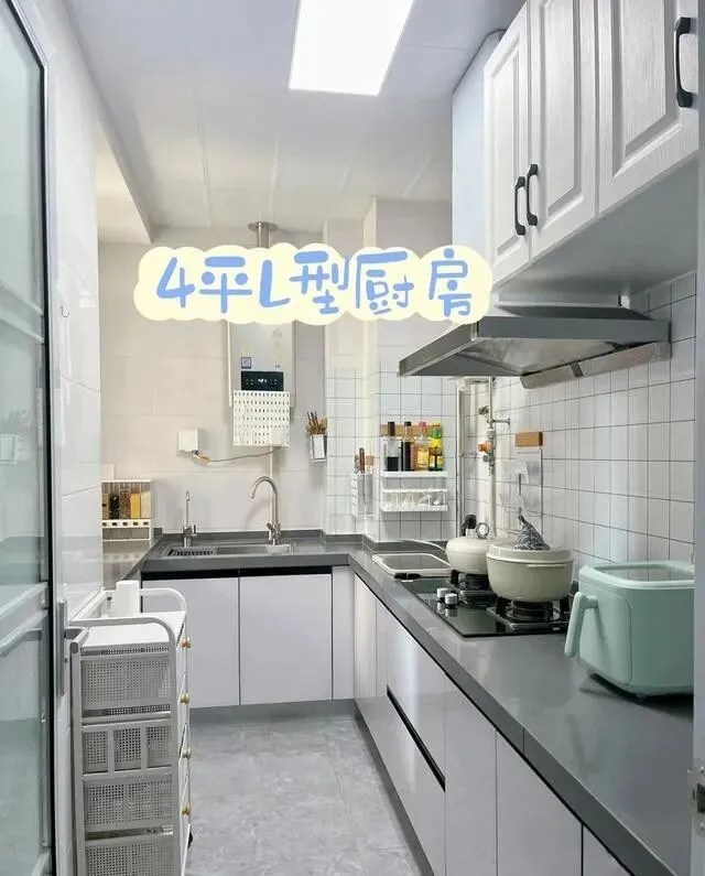 墙上小白砖 , 清清爽爽的 , 文艺又好打理 , 墙面装了置物架放调料 , 地上还有个小推车装菜和锅具 , 台面基本不堆东西 , 整洁得让人舒服。