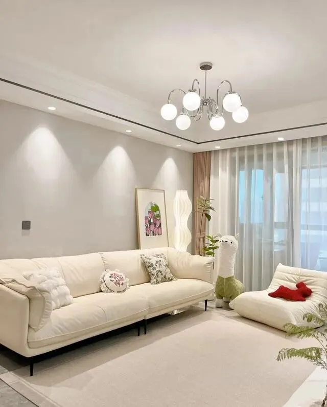 沙发背景刷的浅灰色 , 搭配米白色沙发和地毯 , 温柔又耐看。