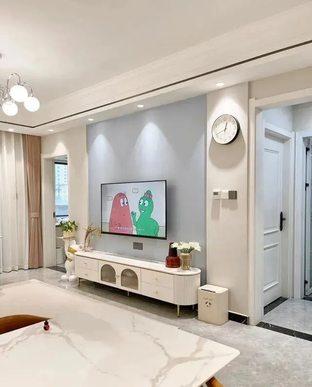 电视墙中间刷了灰蓝色 , 两边留白 , 简单但不单调。
