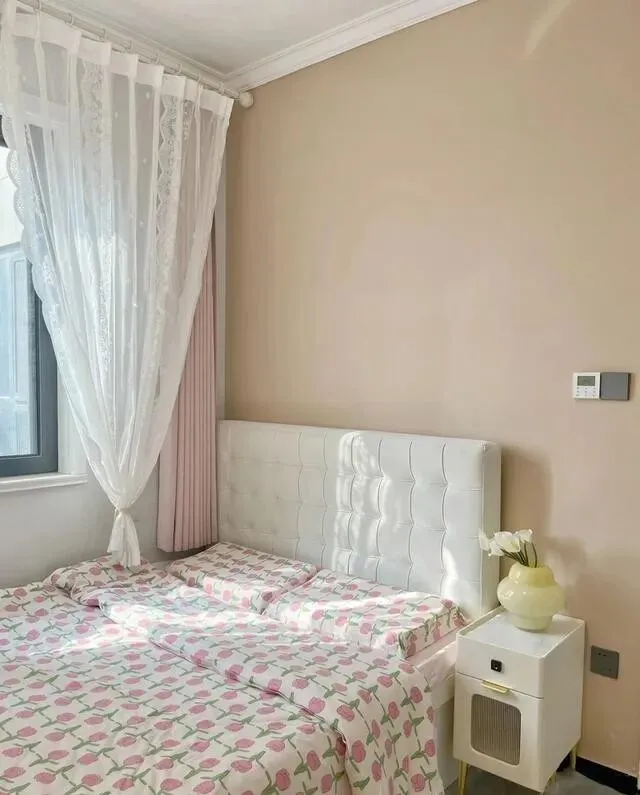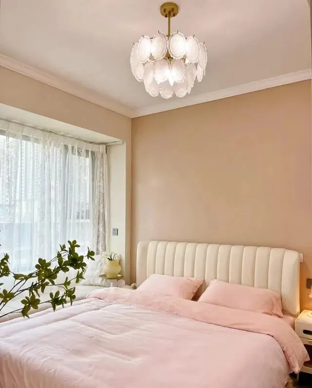 床头刷的奶咖色 , 配粉色床品和花朵吊灯 , 又浪漫又温柔 , 女生看了谁不心动?