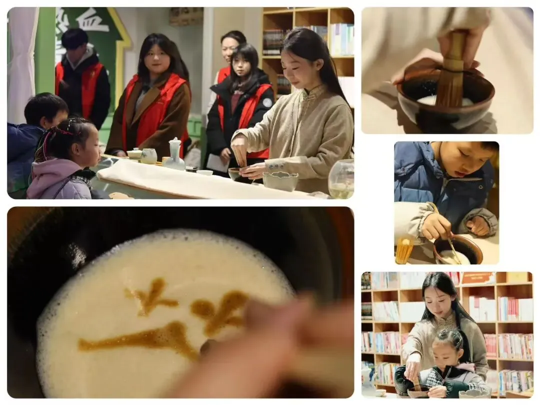 活动现场,志愿者首先展示了宋代点茶技艺。一名志愿者进行技艺示范,完整呈现调膏、击拂、分茶的全流程,另一名志愿者在旁进行讲解点茶的历史和“雪沫乳花”的风雅意境。茶筅在茶盏中上下翻飞,细腻的抹茶粉逐渐化作绵密如雪的茶沫,生动再现了宋韵风雅,让居民直观感受非遗技艺的独特魅力。随后志愿者邀请现场小朋友参与其中,手把手指导孩子们掌握茶筅击拂技巧和点茶的乐趣。孩子们兴致盎然,在互动中沉浸式触摸传统文化,领略千年茶事的趣味与温度。