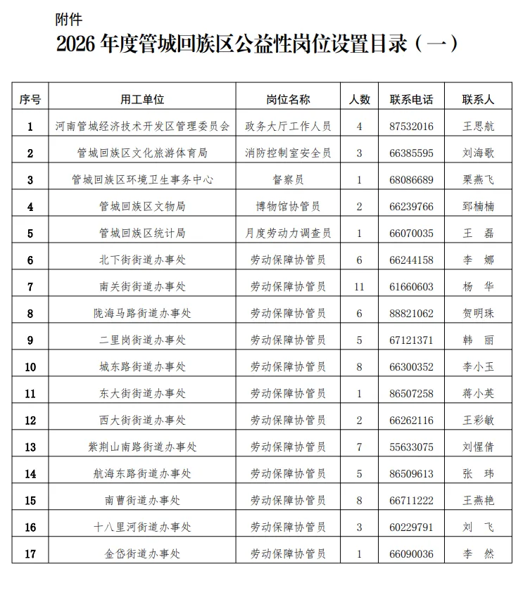 本次计划公开招聘公益性岗位工作人员共74名,相关要求见附件《2026年度管城回族区公益性岗位设置目录(一)》。