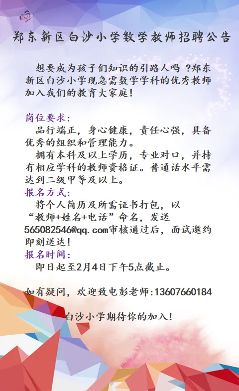 【郑州招教】郑东新区白沙小学招聘教师公告(2月4日17:00前报名)