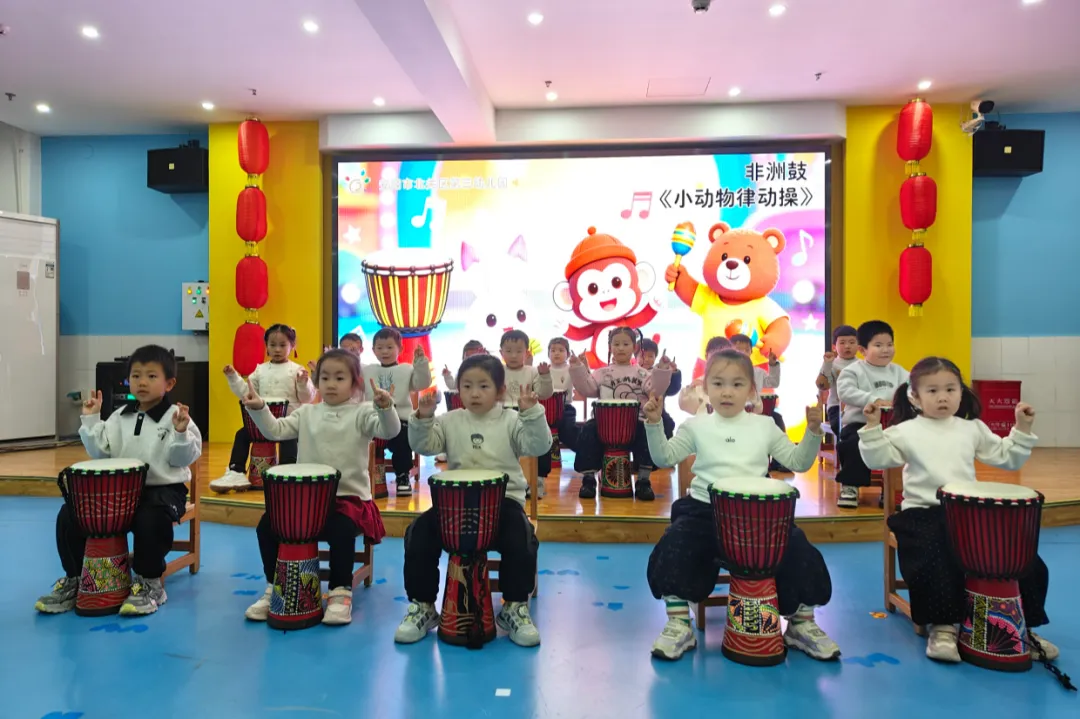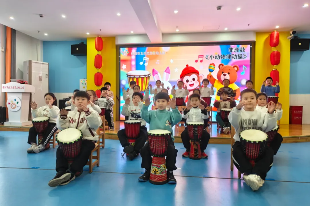 非洲鼓《小动物律动操》充满童趣,孩子们随着节奏快乐摇摆。