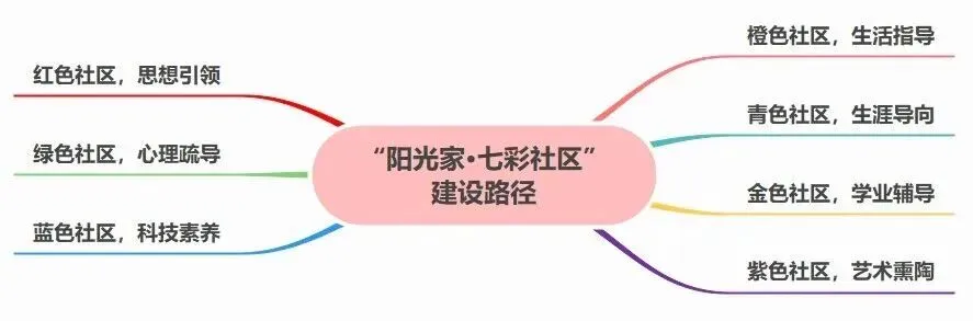 “七彩社区”成长导师制融合“一站式”社区与全员导师制,组建多元导师队伍,以红、橙、黄、绿、青、蓝、紫七色对应思想引领、学业辅导、心理疏导、生活指导、科学素养、生涯向导和艺术熏陶七大维度,构建全方位、个性化成长支持体系。