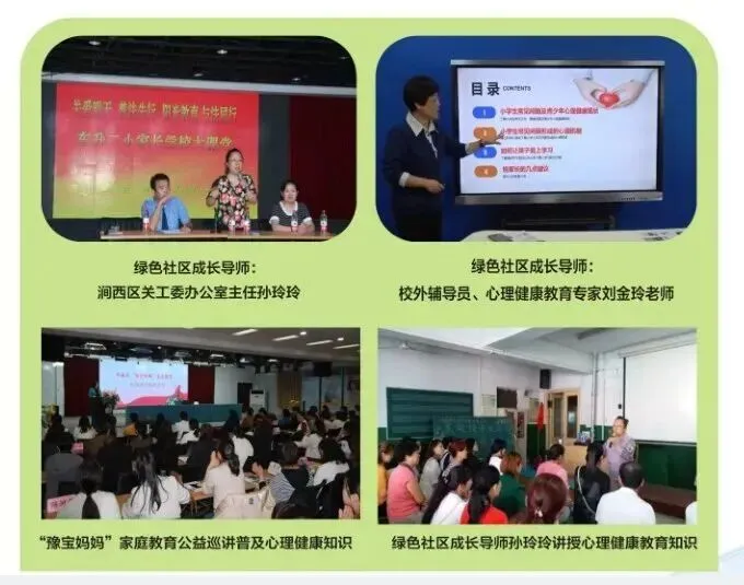 聘请涧西区关工委主任孙玲玲为绿色社区成长导师,开展“豫宝妈妈”家庭教育公益巡讲,推动家校社协同育人,用心用情促进儿童健康成长、全面发展。