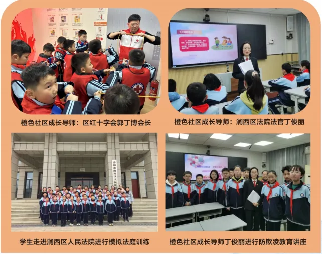 聘请区红会郭丁博会长、法院丁俊丽法官为橙色社区成长导师。每周分批组织学生到“红十字生命健康安全体验馆”实践学习,开展生命安全教育课程;带领学生走进涧西人民法院,通过参观法庭、听法官讲解案例等,零距离感受法治力量增强法治意识;邀请退伍老兵入校开展国防教育,拓宽学生视野,增强爱国主义情怀。
