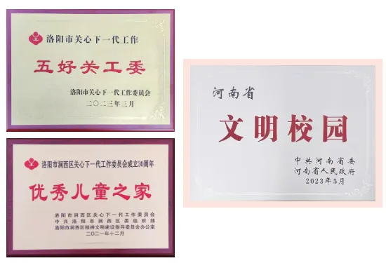 学校先后荣获国家体育后备人才基地、全国优秀少先队集体、河南省中小学党建带队建工作示范校、河南省文明校园、河南省中小学示范性图书馆、河南省心理健康示范校、河南省示范家长学校、洛阳市“五好”关工委、洛阳市“中华魂”(中华好家风)主题教育活动先进集体、涧西区“优秀儿童之家”等殊荣。近三年,周艳慧等28位教师获评家庭教育指导师,孙燕等20位教师成为心理健康教育指导师,学生2000余人次在各级竞赛中获奖,彰显家长学校工作扎实成效。
