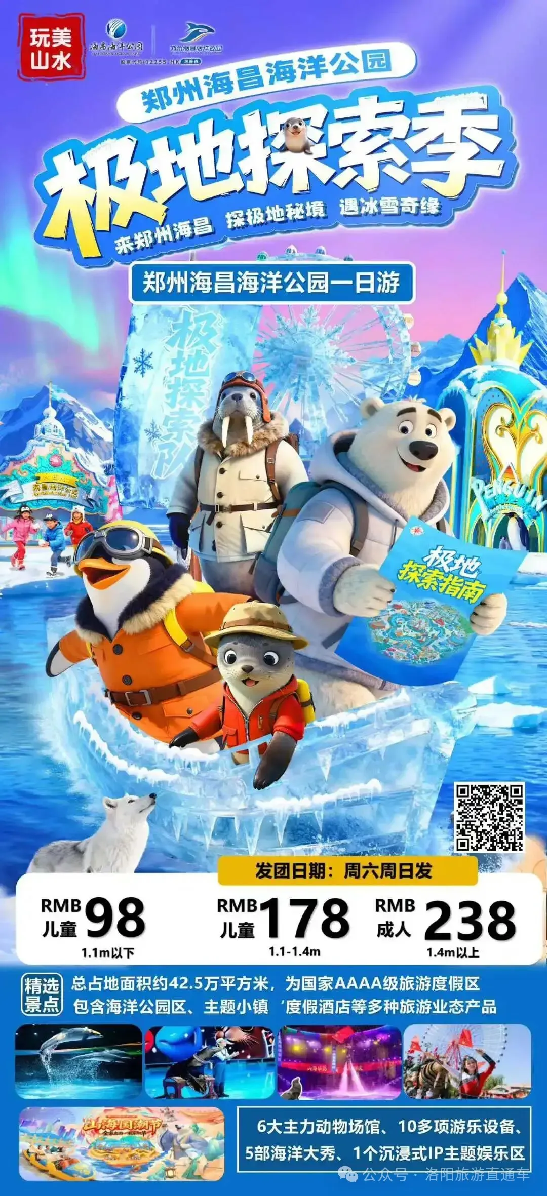 洛阳早指定地点集合发车,赴郑州中牟海昌海洋度假区,参观陆地海洋,六大动物展示馆,海梦秀场/极地动物馆/奇妙海洋馆/欢乐剧场/南极企鹅馆/梦幻水母馆等,置身奇妙极地海洋世界,开启前所未有的极地海洋之旅。