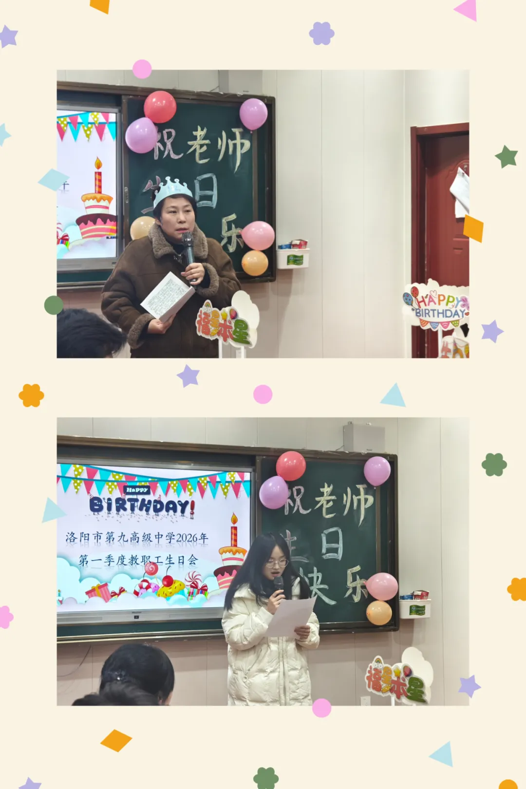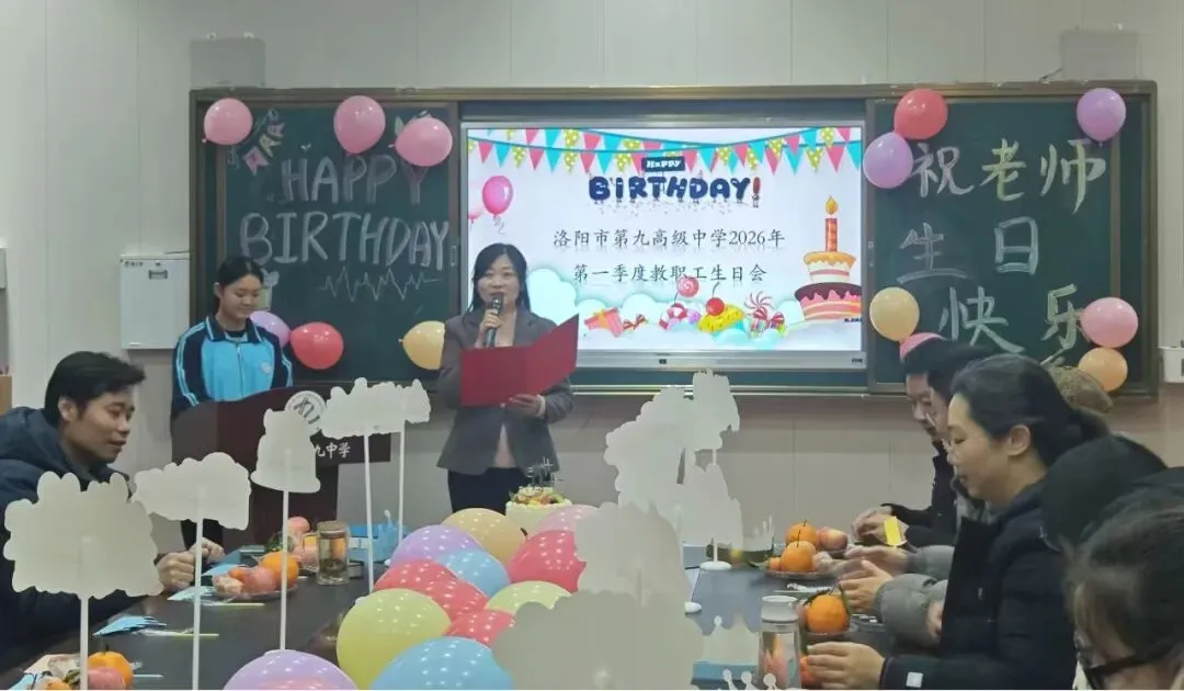 烛光映笑脸,暖意融隆冬。为营造温馨和谐、团结向上的校园文化氛围,提升教职工的归属感与幸福感,2026年1月29日上午,洛阳市第九高级中学举办了第一季度教职工集体生日会。学校领导、寿星老师及学生代表齐聚一堂,共同见证这一温情时刻。