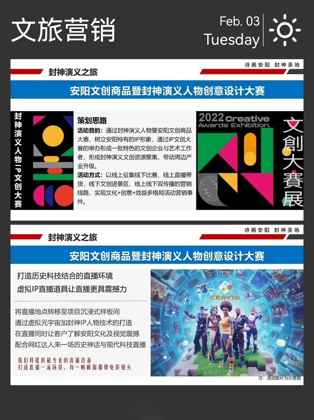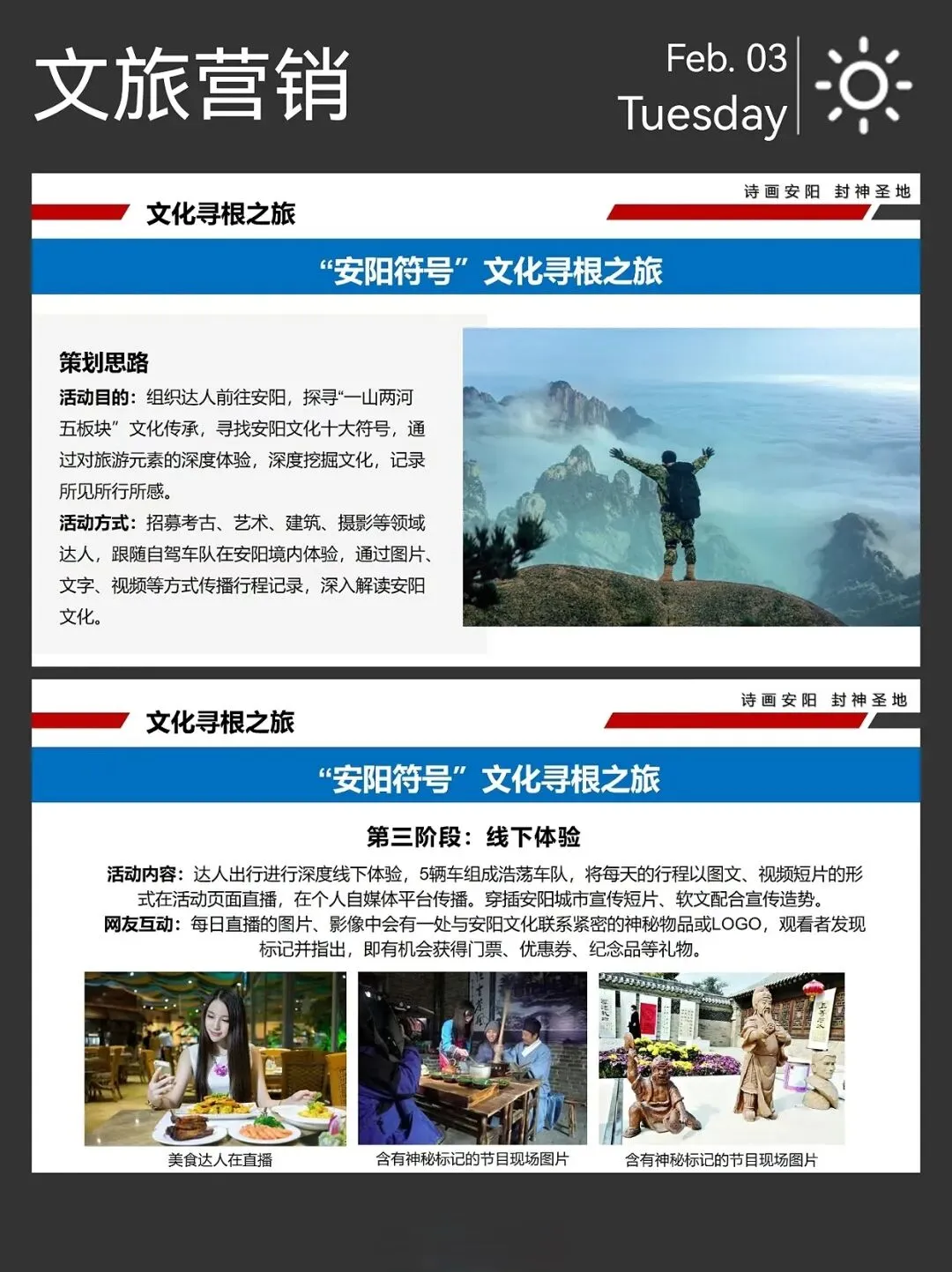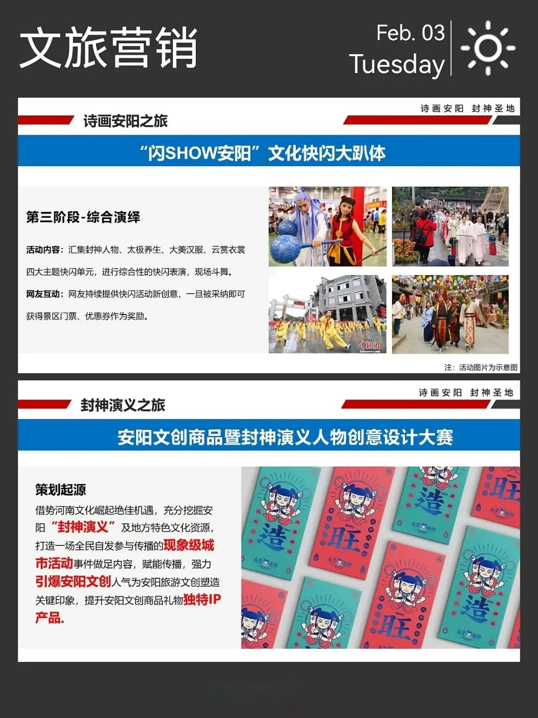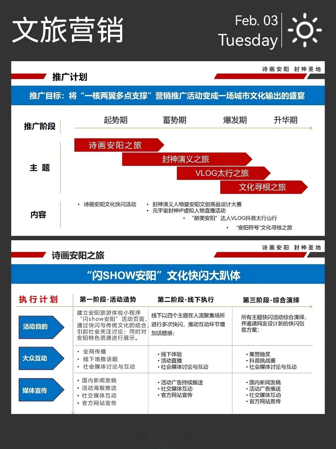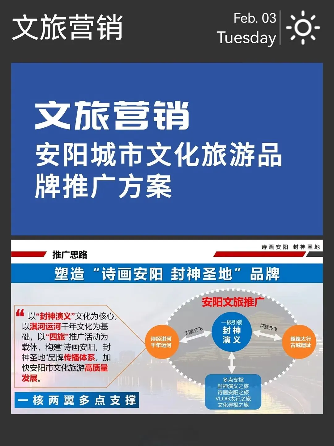 本项目以品牌IP塑造、山水城夯基础及极致文化客流为推广方向,以四旅为活动载体,通过文化快闪、设计大赛、新媒体打卡、寻根文化四大特色宣传本项目,构建安阳品牌传播体系,促进文化旅游高质量发展,让更多客群了解城市,刺激城市消费的目的。