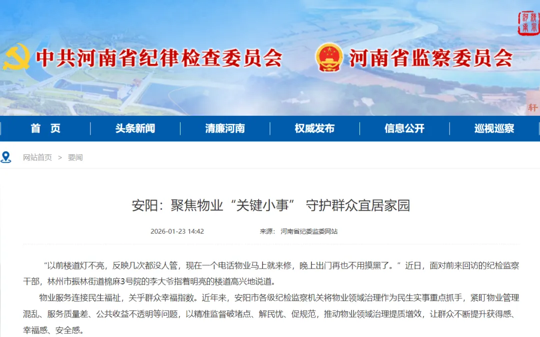 物业服务连接民生福祉,关乎群众幸福指数。近年来,安阳市各级纪检监察机关将物业领域治理作为民生实事重点抓手,紧盯物业管理混乱、服务质量差、公共收益不透明等问题,以精准监督破堵点、解民忧、促规范,推动物业领域治理提质增效,让群众不断提升获得感、幸福感、安全感。