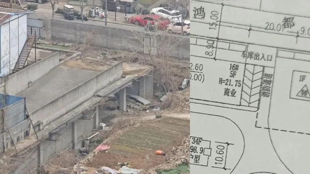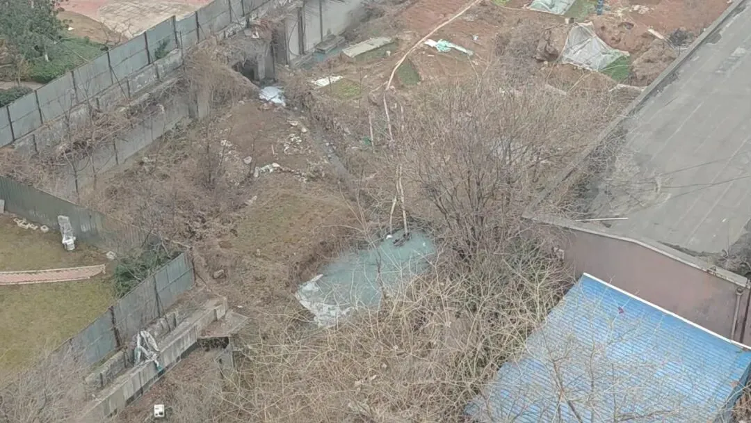 1月29日,记者在繁华城小区楼上看到,小区与相邻空地仅一“墙”之隔。在居民的指引下,记者从高处俯瞰,铁皮围挡外约20米处有一个巨大的长方形水坑。由于正值寒冬,水面已经结冰,但一条从楼体引出的引水渠清晰可见。