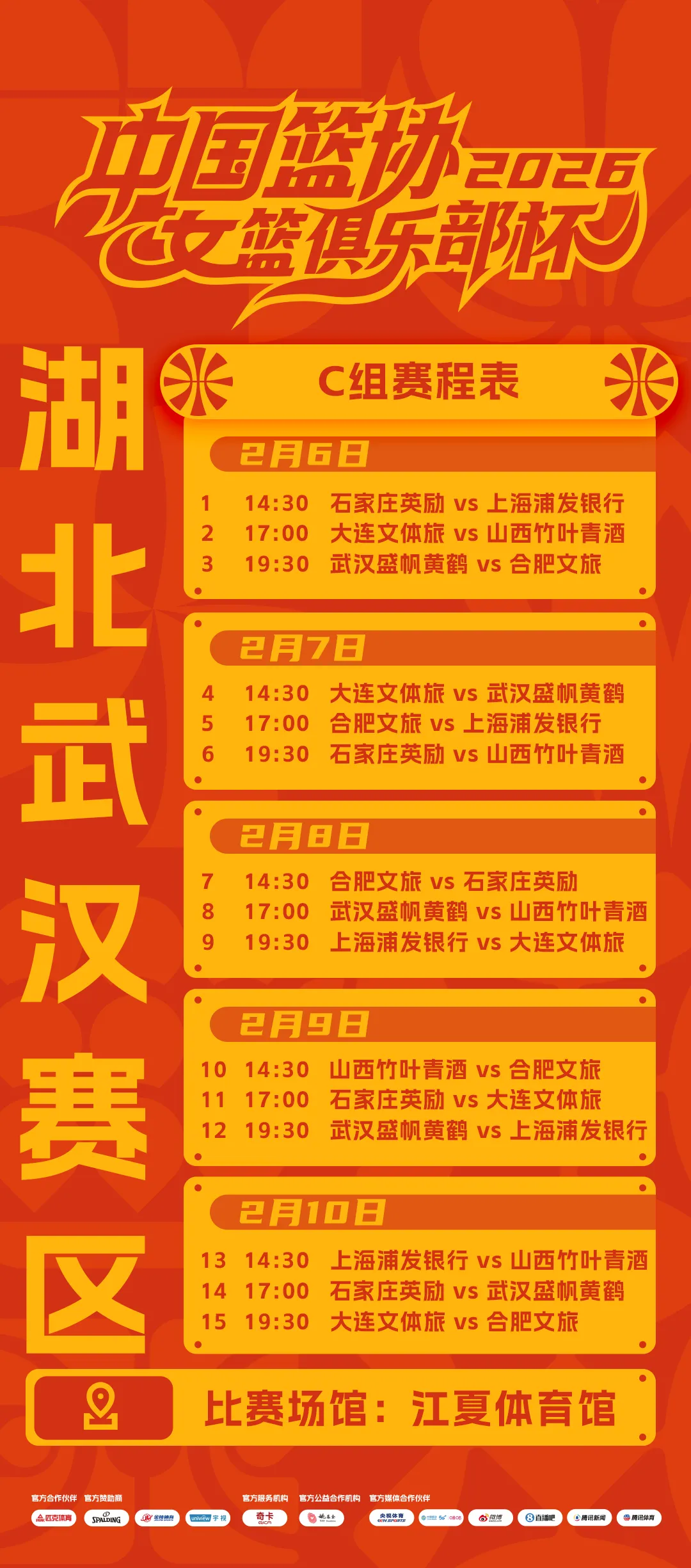 2月6日-10日,2026年中国篮球协会女子篮球俱乐部杯(“安阳湖橄榄油”武汉赛区),将在江夏体育馆打响。届时,山西竹叶青酒、上海浦发银行、石家庄英励、武汉盛帆黄鹤、大连文体旅、合肥文旅,6支队伍将在5天时间上演15场激烈较量。