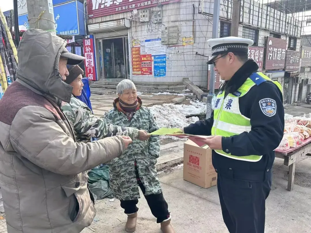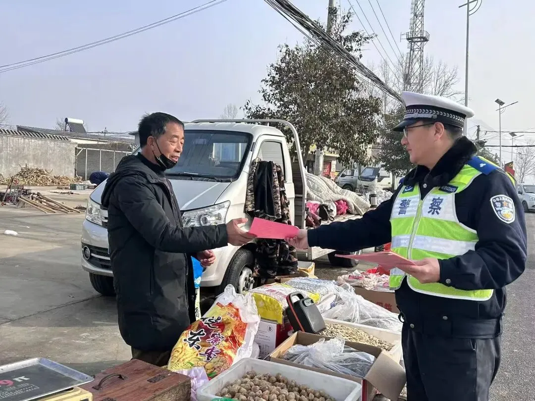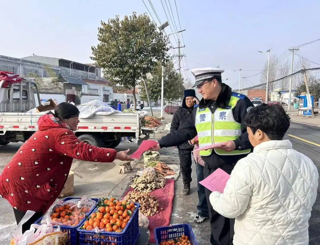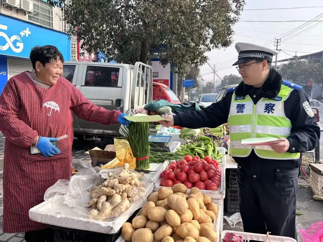 民警因地制宜开展精准宣传,摒弃集中式宣讲模式,以发放宣传彩页、面对面零距离讲解为主要方式,穿梭在集市各个摊位间,重点围绕菜农、商贩及零散赶集群众的出行特点开展宣传。