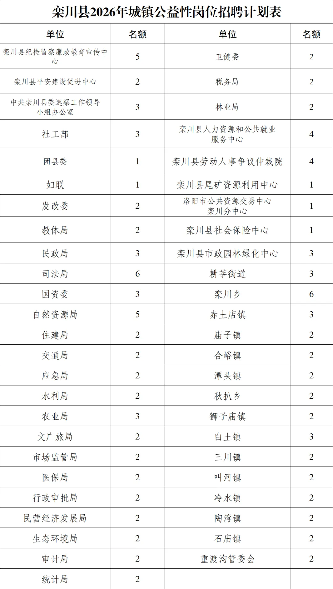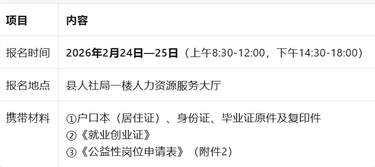 为促进就业困难人员就业,搭建供需对接平台,根据《河南省公益性岗位管理办法》(豫人社办〔2020〕23号)、《洛阳市公益性岗位开发管理实施细则》(洛人社〔2020〕25号)及《关于确定洛阳市2026年城镇公益性岗位开发计划的通知》(洛人社就业〔2026〕1号)精神,现将我县公益性岗位招聘有关事项公告如下: