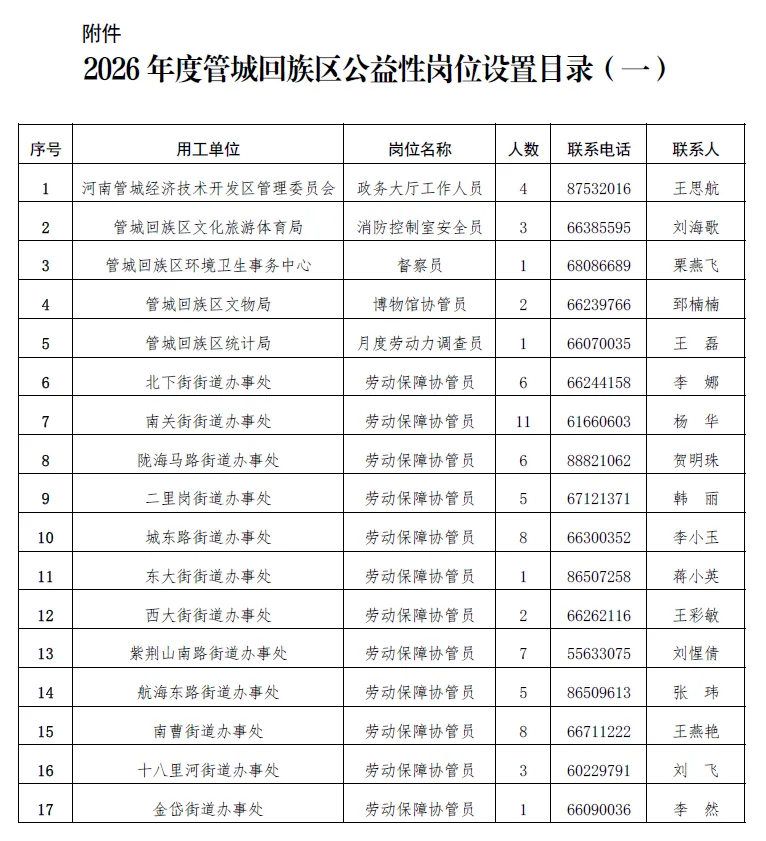 本次计划公开招聘公益性岗位工作人员共74名,相关要求见附件《2026年度管城回族区公益性岗位设置目录(一)》。