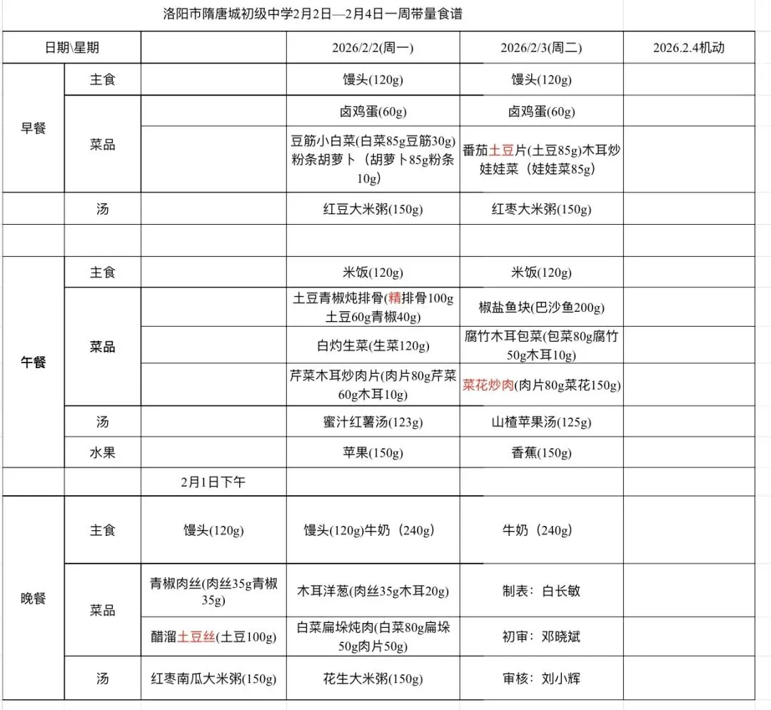 为了保证在校师生每日营养摄入量,洛阳市隋唐成初级中学严格按照每日的膳食推荐摄入量为师生们制定了食谱,让师生们的每一餐都吃的营养,吃的健康,吃的安心!