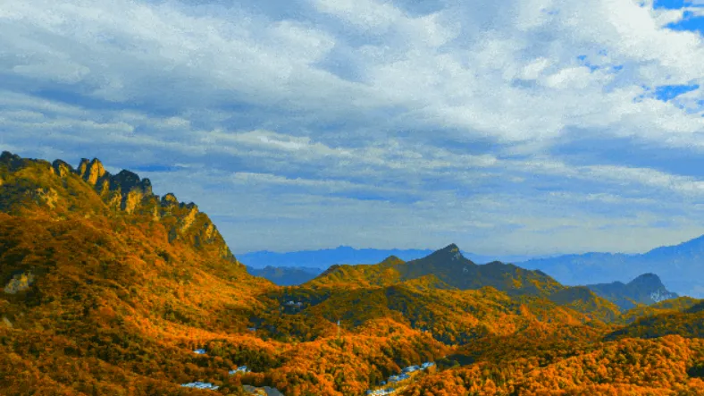 老君山藏着浓烈的浪漫,五角枫的橙红、黄栌的火红交织在一起;荆紫仙山的红叶漫山遍野,层林尽染;白云山旁的银杏,叶片簌簌飘落,铺成柔软的金毯,风过叶响。