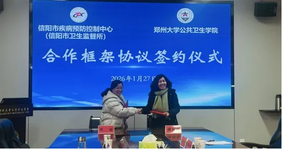 为深入贯彻“健康河南”战略,推动区域公共卫生事业高质量发展,2026年1月27日,信阳市疾病预防控制中心(信阳市卫生监督所)与郑州大学公共卫生学院在郑大签订战略合作框架协议。郑州大学公共卫生学院院长臧明玺,信阳市疾病预防控制中心(信阳市卫生监督所)党委书记、主任张丽,双方领导班子成员及相关专家共同出席签约仪式。