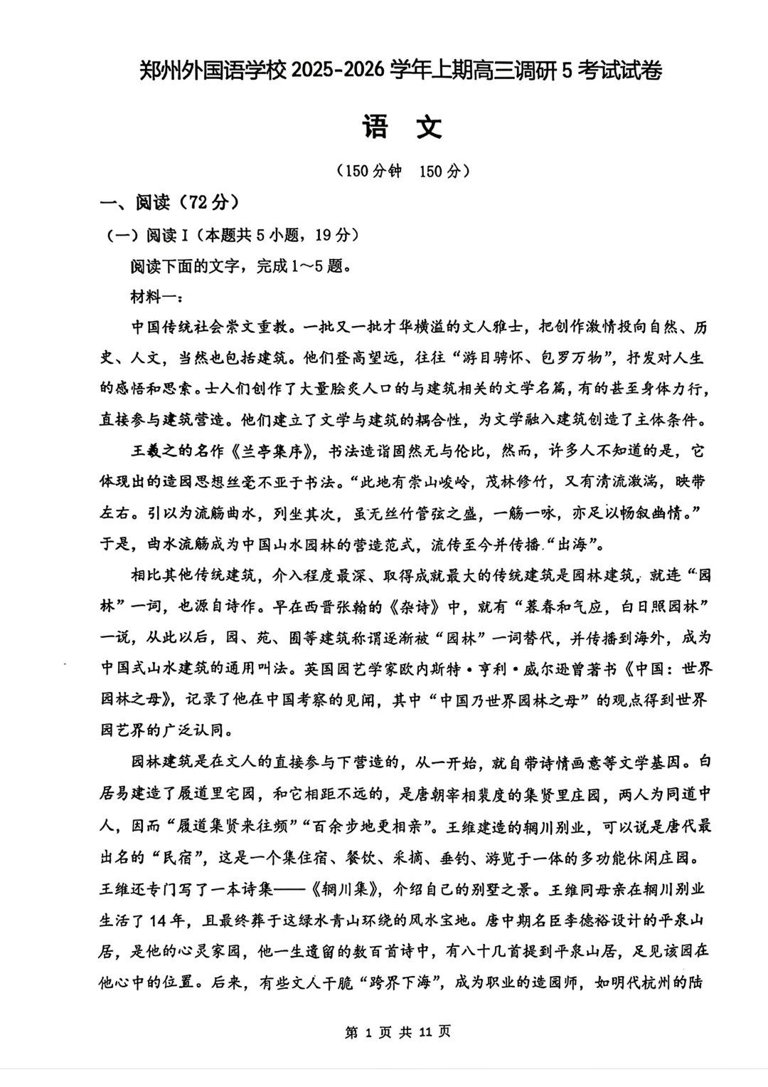 >郑州外国语2025-2026学年高三调研5语文&数学&英语试卷及答案