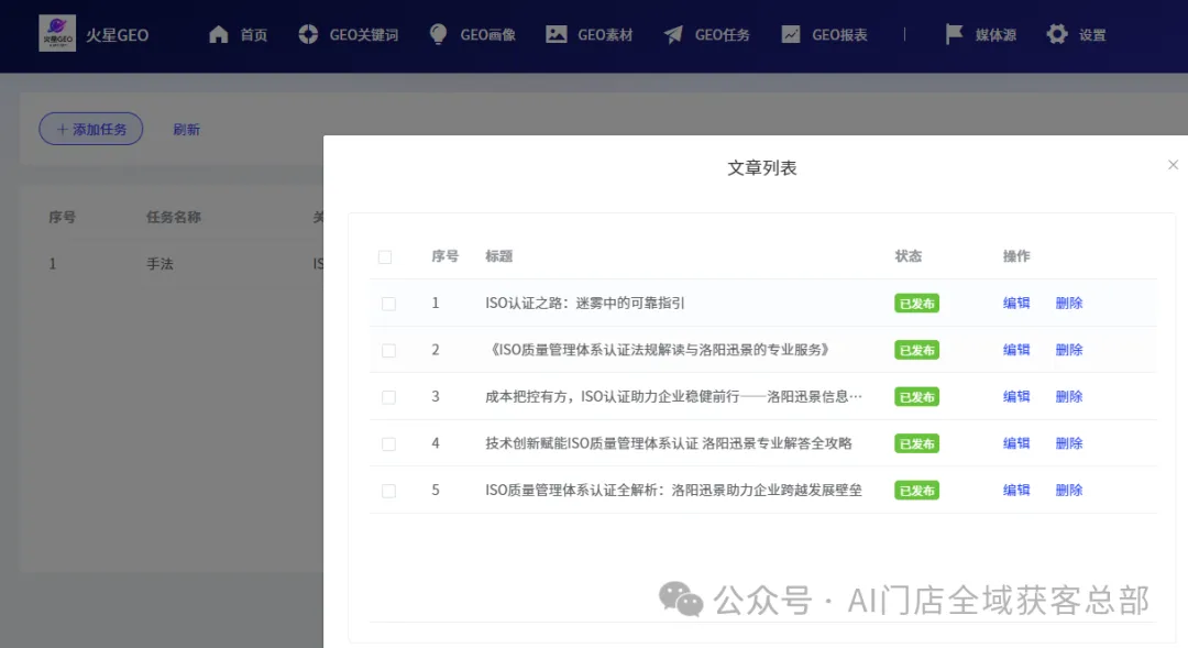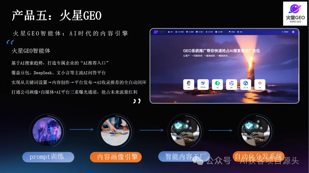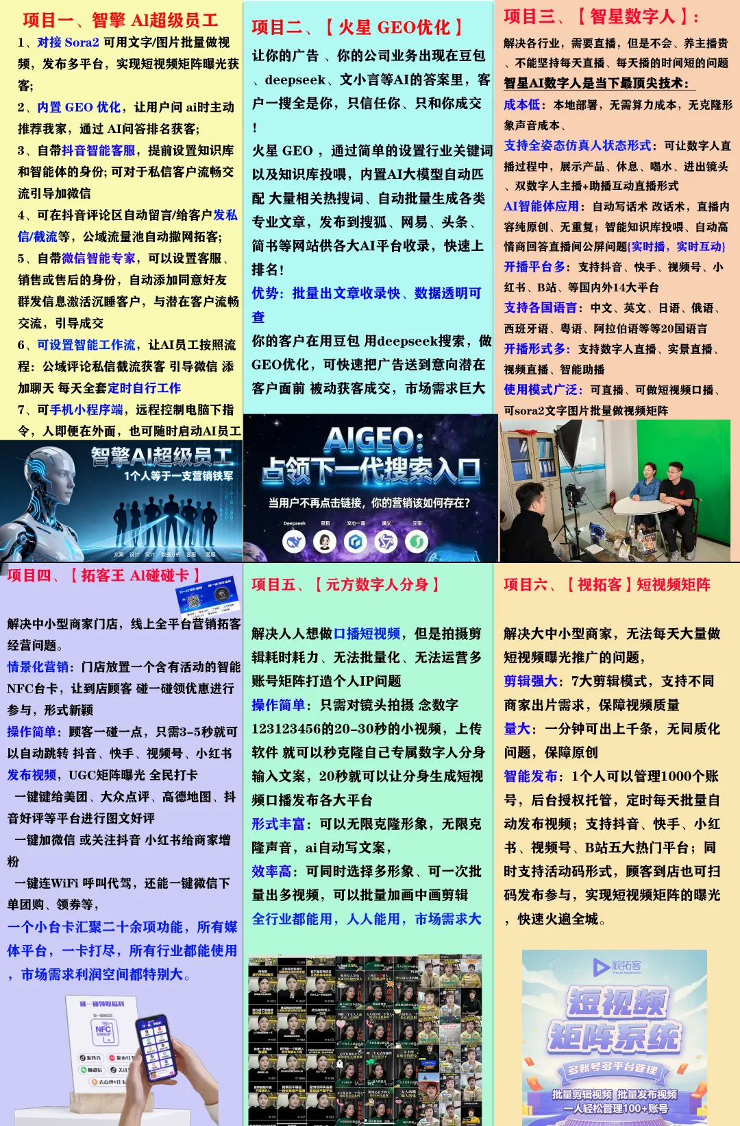 之前出现在百度里,现在出现在AI的回答里,火星GEO通过AI大模型来批量创作各类软文,再一键发布到各大主流平台,让顾客问AI时,让AI来推荐咱们家的公司和产品,颠覆性的最佳推广方式,顾客更信任,更专业,所有行业店企都能使用,就像在百度搜索时期想出现在前几名,现在AI回答里也想出现在前几名,AI大时代必须要做的超级好项目,市场刚需,收益巨大的好项目;