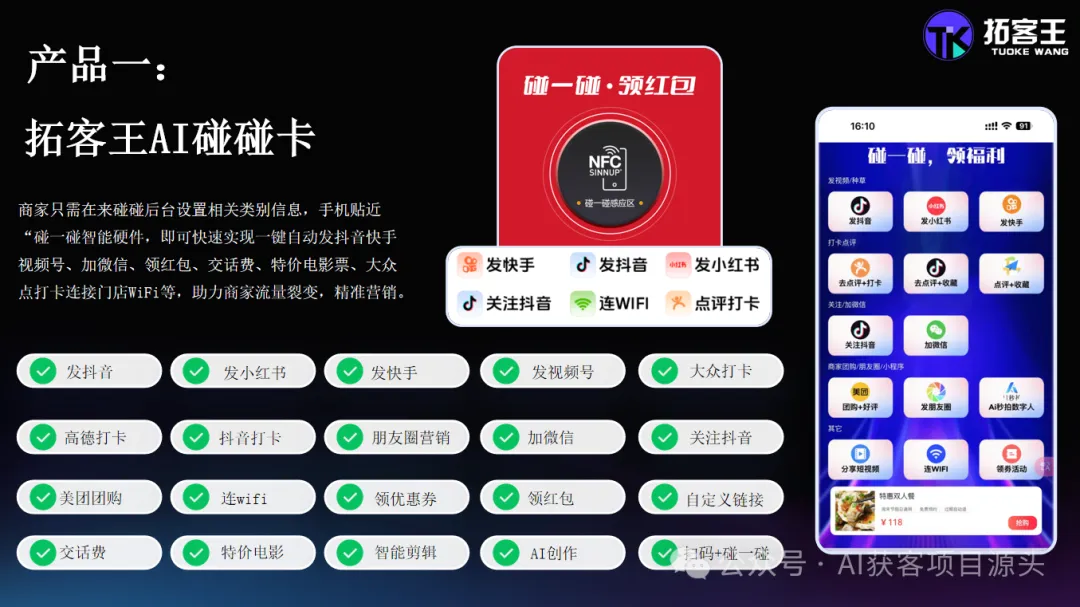 解决商家不会做各项新媒体平台推广的问题,只需一个碰一碰智能台卡,让每个到店顾客碰一碰,就可以一键发商家短视频到抖音、快手、视频号、小红书、B站等五大短视频平台,还能一键给美团、大众点评、高德地图、抖音好评等平台进行图文好评,还能玩转微信私域营销,还能一键下单团购、领券等,一个小台卡汇聚二十余项功能,所有媒体平台,一卡打尽,所有行业都能使用,市场需求利润空间都特别大。
