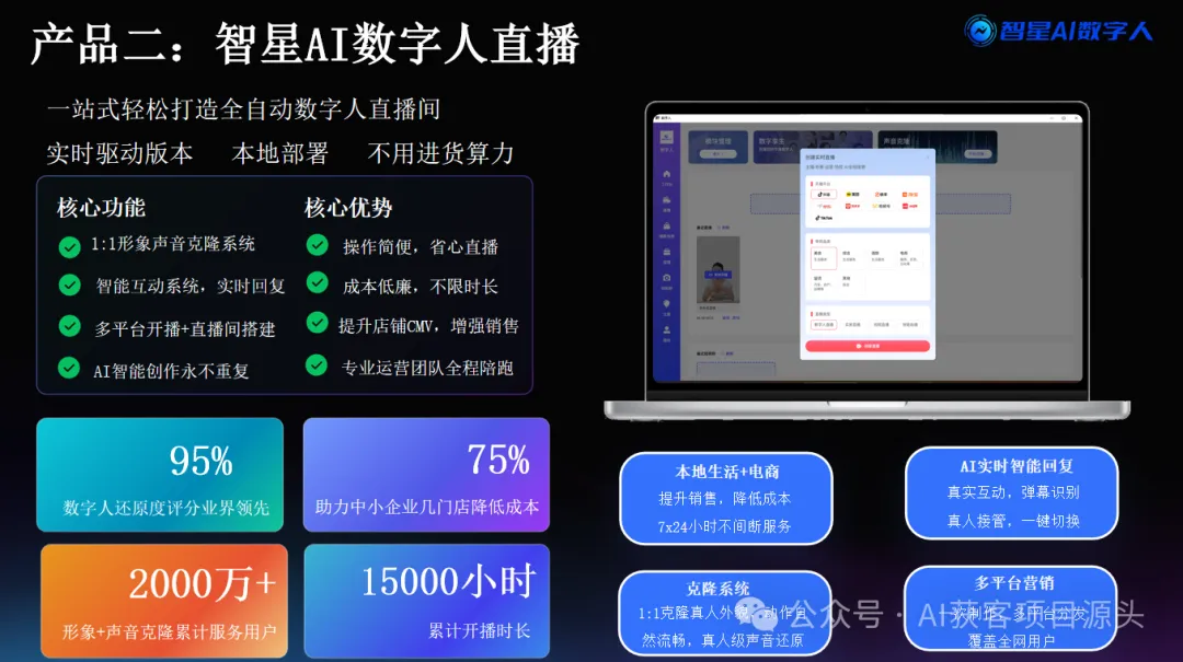 解决各行业不能坚持每天直播的问题,数字人克隆自己形象 做直播,原创话术,原创回答,永不重复,不是录播,实时驱动,不用买算力,这个是当下数字人直播国内最顶尖的技术,开播平台支持抖音、快手、视频号、小红书、B站、美团、百度、淘宝、京东、拼多多、等国内十大平台,以及国外的阿里巴巴国际站、TikTok、Shopee、YouTube,共十四大平台都支持直播,做本地生活能用,做电商带货能用,做留客资也能用,2亿商家+公司都能用,市场需求和利润空间超大;