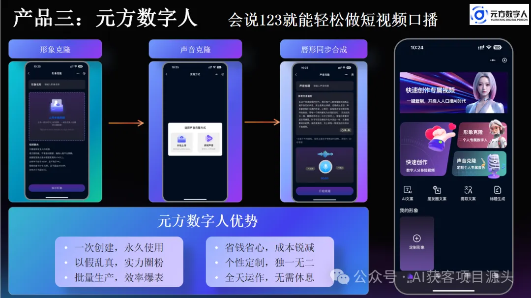 解决人人无法坚持做短视频口播的问题,克隆自己的分身来做短视频口播,可以无限克隆形象,无限克隆声音,ai自动写文案,输入文案就可以让分身生成做短视频口播,解决大家想做短视频口播自己做不成的问题,以后就可以轻松做口播,全行业都能用,人人能用,市场需求利润空间特别大;