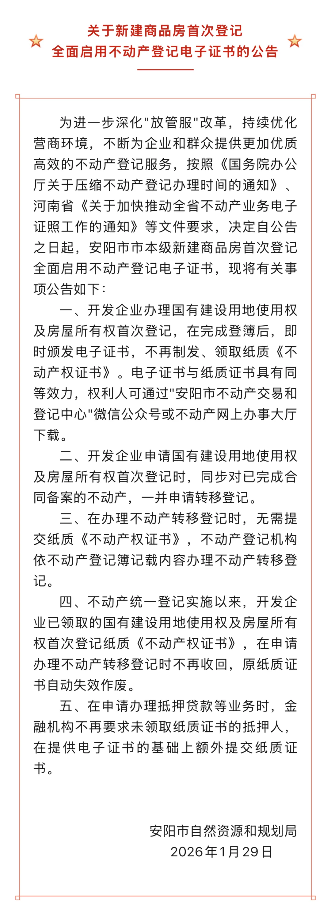 根据新规,开发企业在申请首次登记时,同步对已完成合同备案的不动产一并申请转移登记,不再领取纸质《不动产权证书》;权利人可通过“安阳市不动产交易和登记中心”微信公众号或“安阳市不动产网上办事大厅”网站下载电子证书。在群众后续办理个人不动产权证时,登记机构直接依据登记簿信息办理,不再要求提交纸质证书。此外,不动产统一登记实施以来,开发企业已领取的纸质《不动产权证书》,在办理转移登记时自动失效,无需收回。金融机构在办理抵押等业务时,认可电子证书效力,无需再由抵押人提供纸质证书。