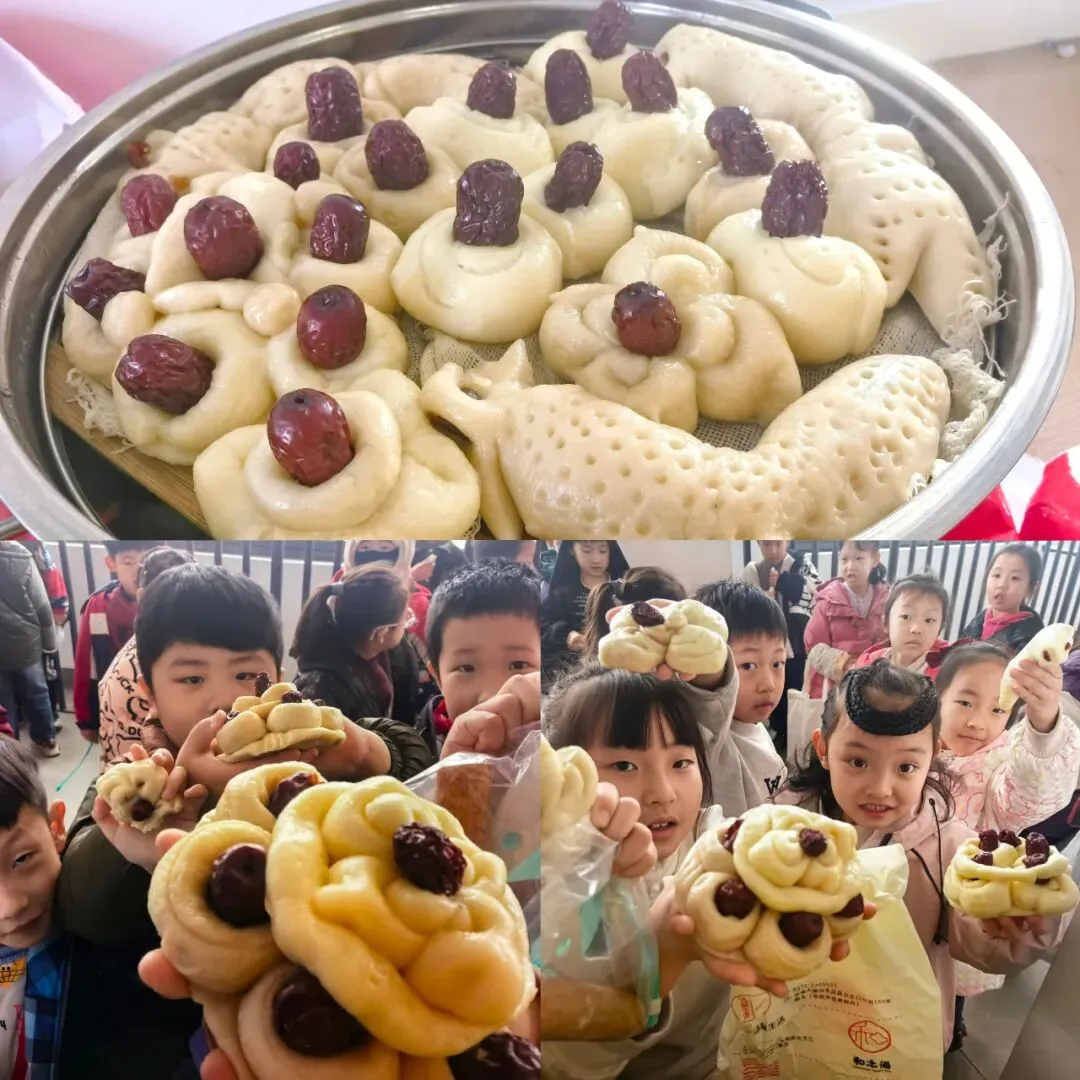 形态各异的花馍上锅蒸制,热气裹挟着面香漫满教室。当白白胖胖的花馍新鲜出炉,欢呼声瞬间填满整个空间。孩子们捧着亲手制作的作品,眉眼间满是自豪,入口的香甜,是面食本味,更是劳动与成长的甘甜。