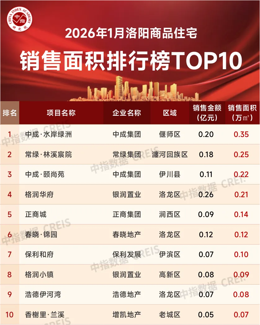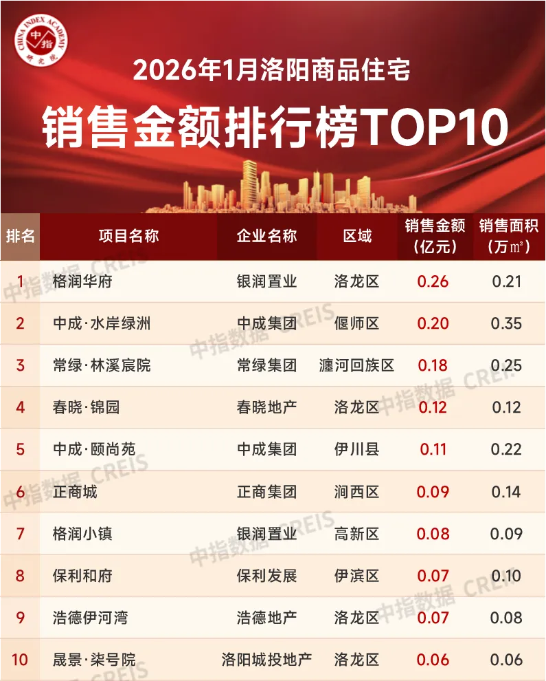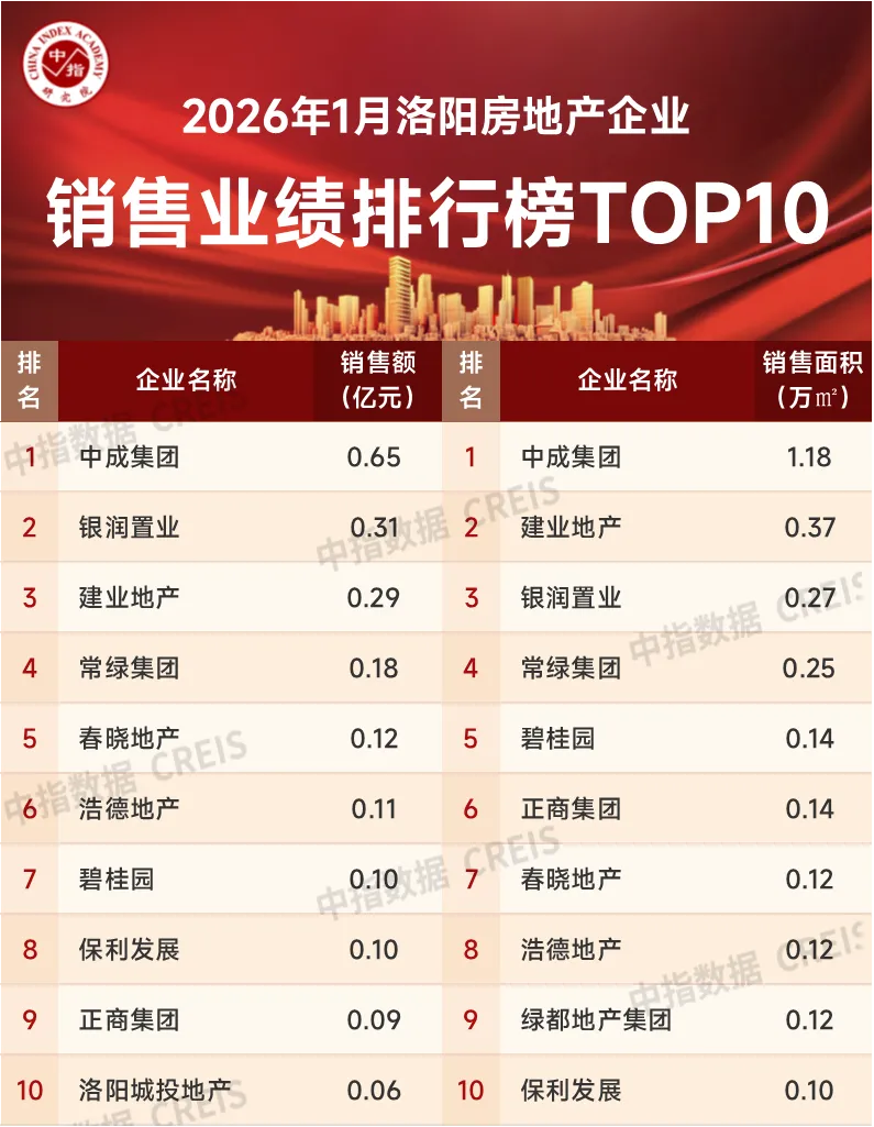 1月,市场进入传统淡季,洛阳房地产市场供需两端整体表现较弱,核心区域品质住房供应不足,购房客户观望情绪阶段性加重,商品房销售面积同比、环比降幅均较大,短期市场压力凸显。那么洛阳的房企及典型项目在2026年1月的销售业绩究竟如何?一起看一下数据表现:https://u.fang.com/ytcrnn/特别声明:房地产企业销售数据统计是以2026年1月1日-1月31日期间销售的商品房为统计口径,包括商品住宅、写字楼、公寓、商业,主要依据中指数据CREIS(点击查看)在洛阳市域范围的销售监测数据,并参考当期总体经营情况和推盘去化情况进行分析统计;对于少数没有在监测范围内的企业和项目,由企业提供相关文件,经审核,也纳入统计范围。本报告仅供参考,不对使用报告及其内容所引发的任何直接或间接损失承担责任。2026年1月,洛阳房地产销售金额TOP10企业合计销售金额为2.01亿元,销售面积TOP10企业合计销售面积2.80万平米。其中TOP10房企销售门槛值为0.06亿元/0.10万平米。中成集团以0.65亿元的销售业绩位列销售金额榜冠军,银润置业以0.31亿元的销售业绩位列销售金额榜单第二名,建业地产以0.29亿元的销售业绩位列销售金额排行榜第三名。销售面积排行榜前三名的企业分别是:中成集团、建业地产、银润置业,销售面积分别为1.18万平米、0.37万平米、0.27万平米。特别声明:各房企项目销售数据统计是以2026年1月1日-1月31日期间销售的商品住宅为统计口径,主要依据中指数据CREIS(点击查看)在洛阳市域范围的销售监测数据,并参考当期总体经营情况和推盘去化情况进行分析统计;对于少数没有在监测范围内的项目,由企业提供相关文件,经审核,也纳入统计范围。本报告仅供参考,不对使用报告及其内容所引发的任何直接或间接损失承担责任。