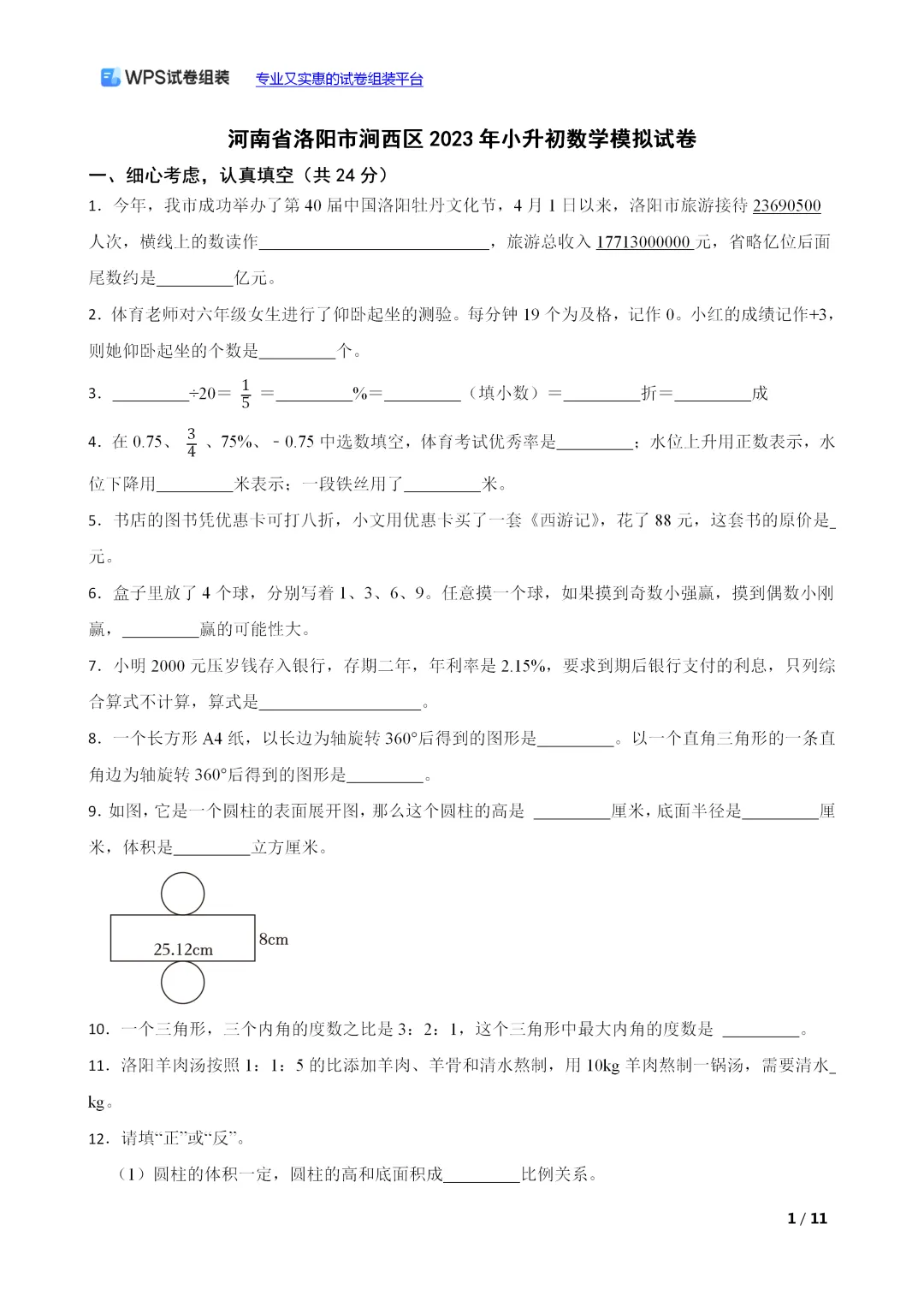 (小升初真题)河南省洛阳市涧西区2023年小升初数学模拟试卷