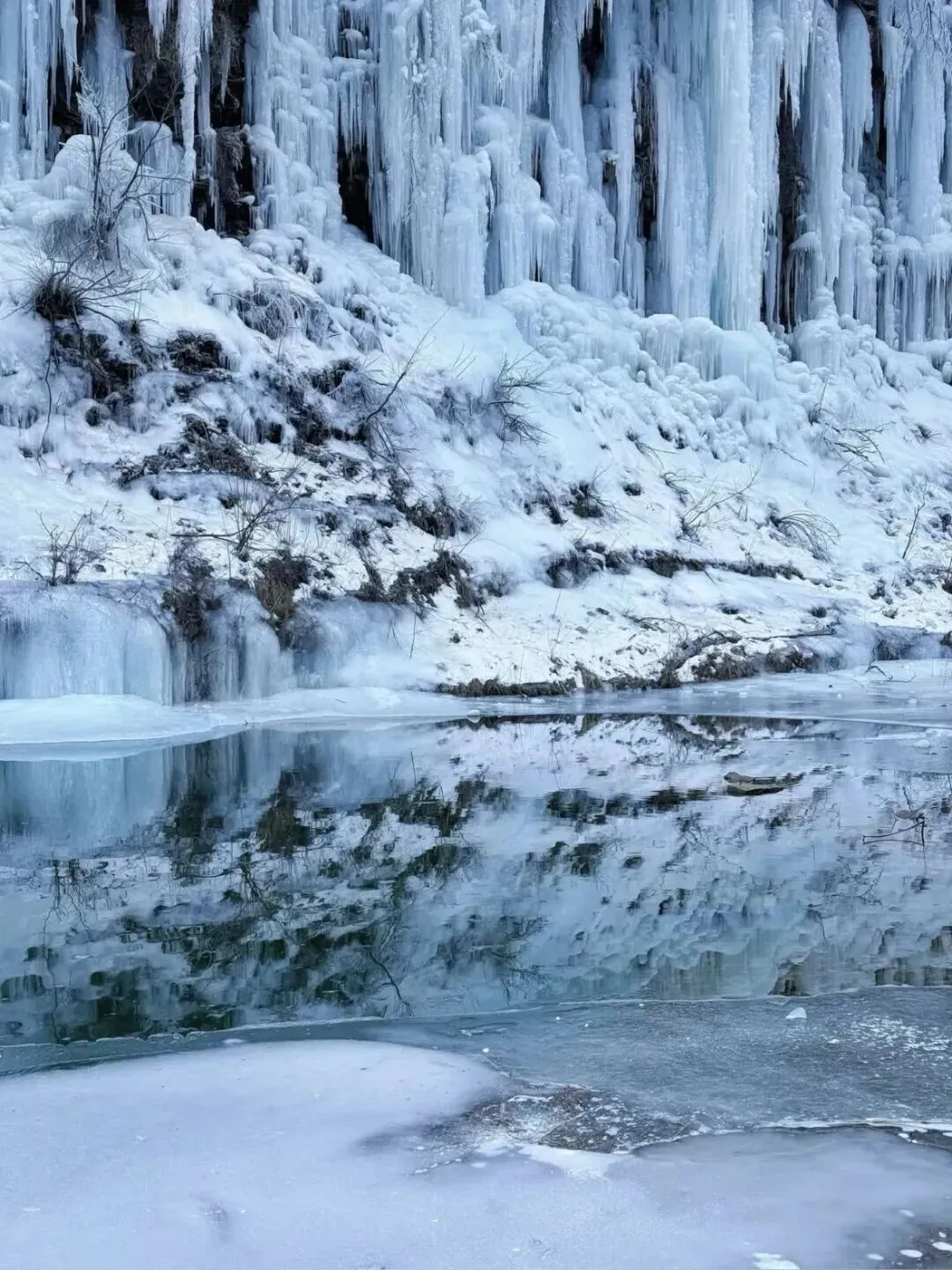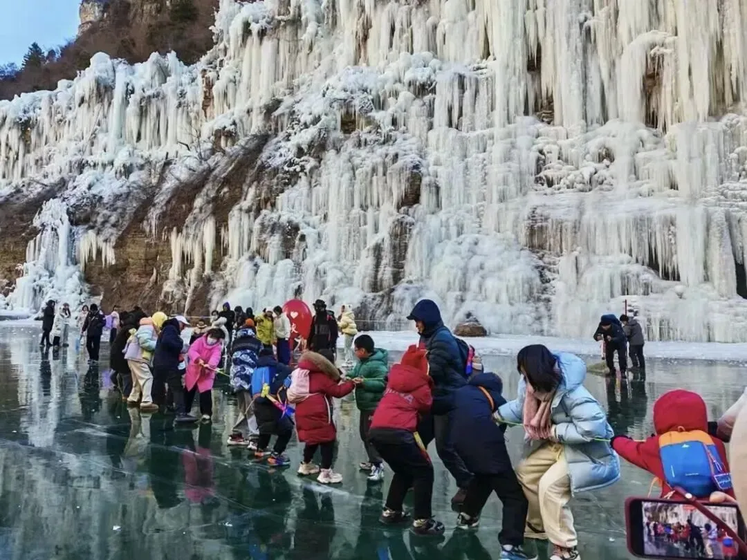 往日奔腾的瀑布,如今在寒冷的冬日里凝固成了巨大的冰雕艺术品。孩子们围着冰瀑,眼中满是惊叹与好奇,不停地问着各种有趣的问题,家长们则在一旁耐心解答,亲子间的互动在这奇妙的冰瀑前愈发温馨。