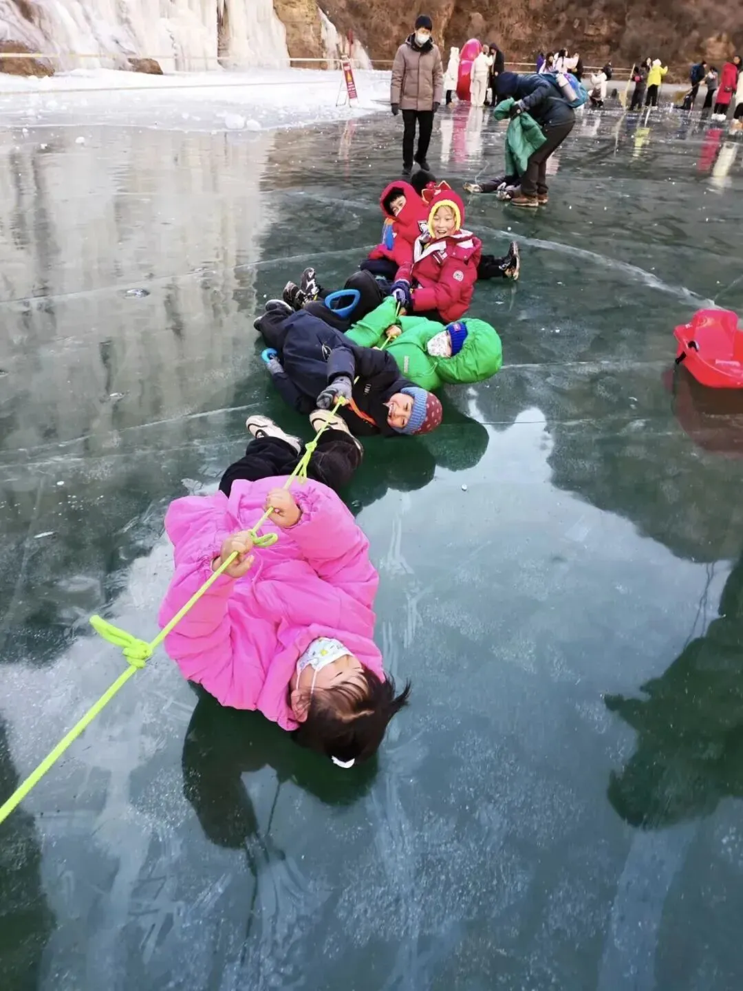 一踏入通天峡,孩子们就像挣脱了束缚的小精灵,欢呼雀跃着奔向这洁白的世界。最让孩子们兴奋的,当属那壮观的冰瀑。