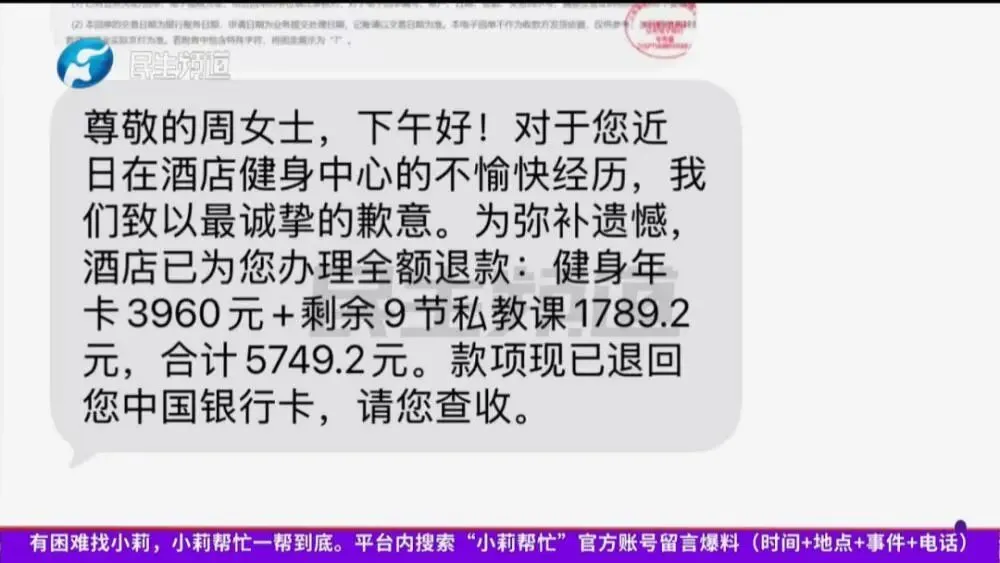 酒店并没有给她任何赔偿,认为就是一个意外,他们的解决方案,就是把周女士剩余的健身年卡3960元加上9节私教课1789.2元,合计5749.2元,全部都退给她了。