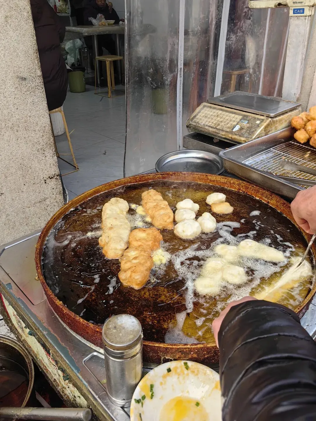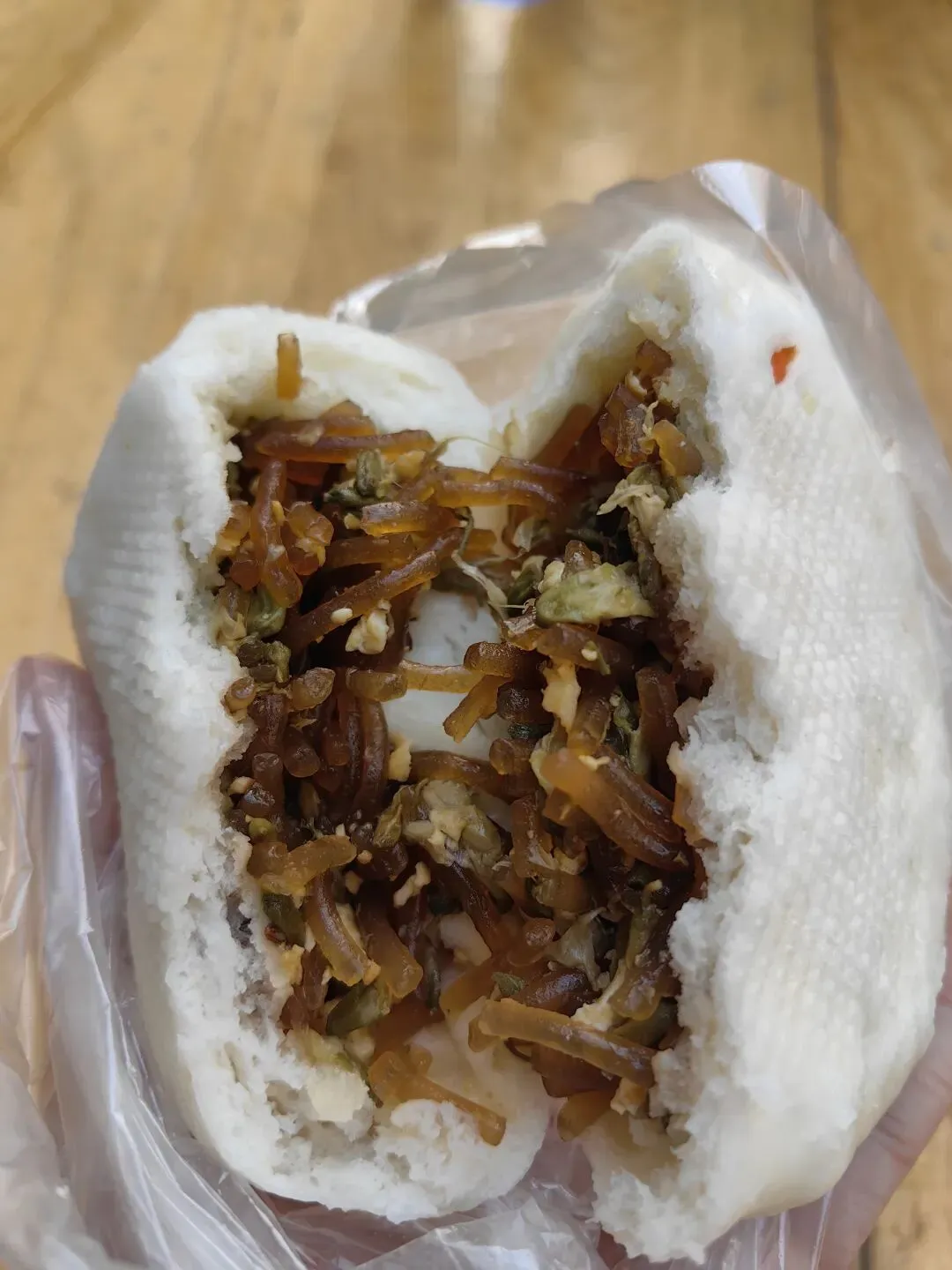 豆沫像清淡版的胡辣汤,越喝越有豆子的味道,就着槐花包吃很顺口。