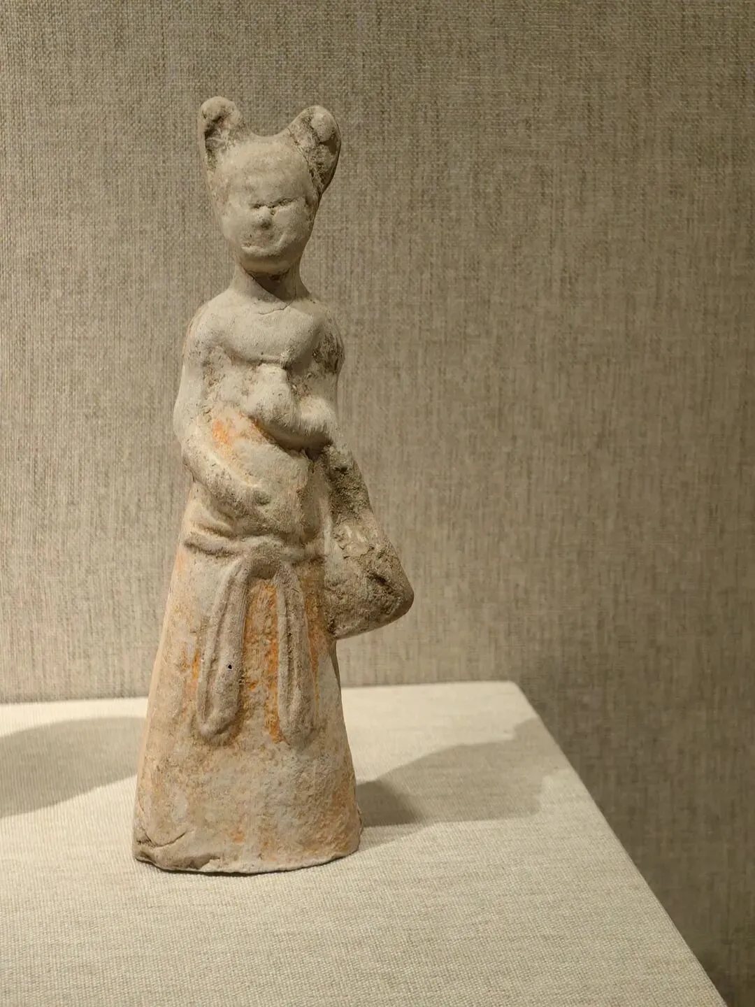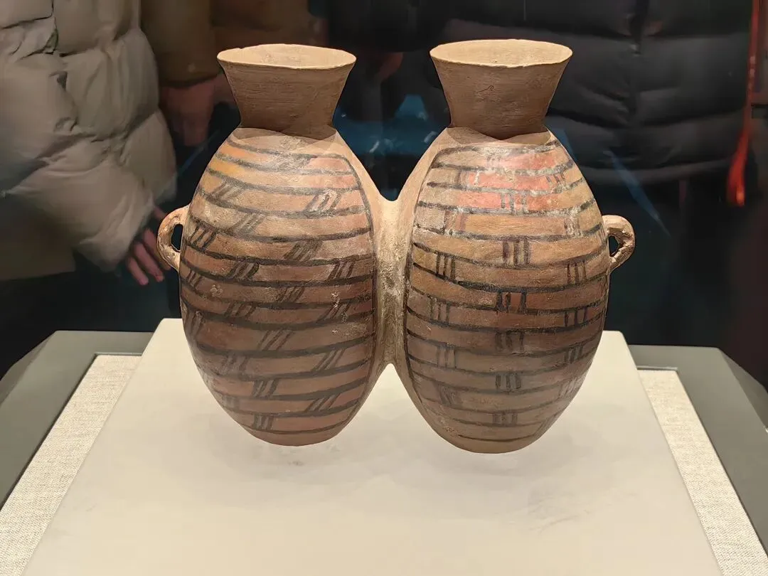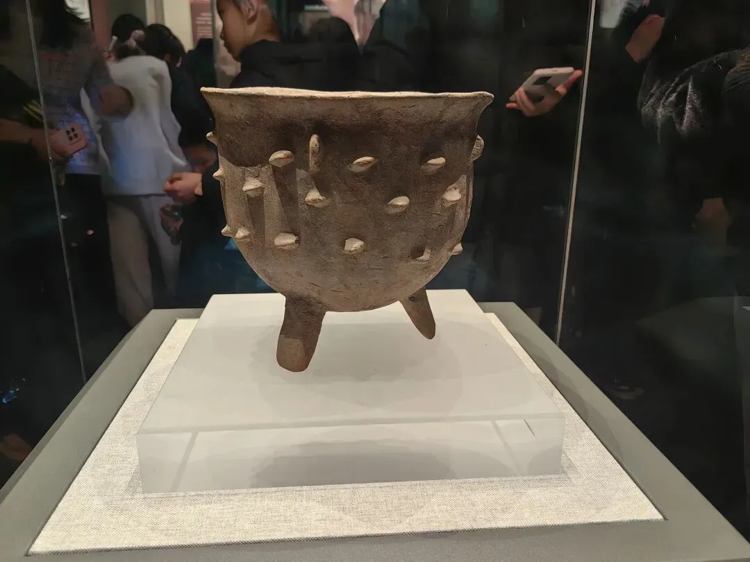 这是乳钉纹红陶鼎,是河南博物院的“镇馆之宝”之一,也是目前中国发现的最古老的完整的陶鼎。它由泥条盘筑法制成,夹砂红陶质地,敞口、深腹、圜底,下附三个足构成稳定支撑。器身布满三排乳钉装饰,兼具美观与实用功能。