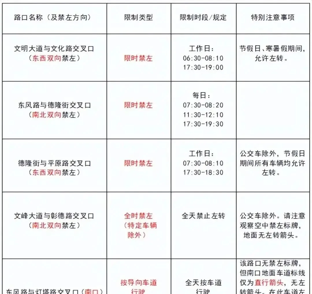 现在直接贴出市区禁左路口清单:文峰路、光明路、中州路,特定时段全禁左。