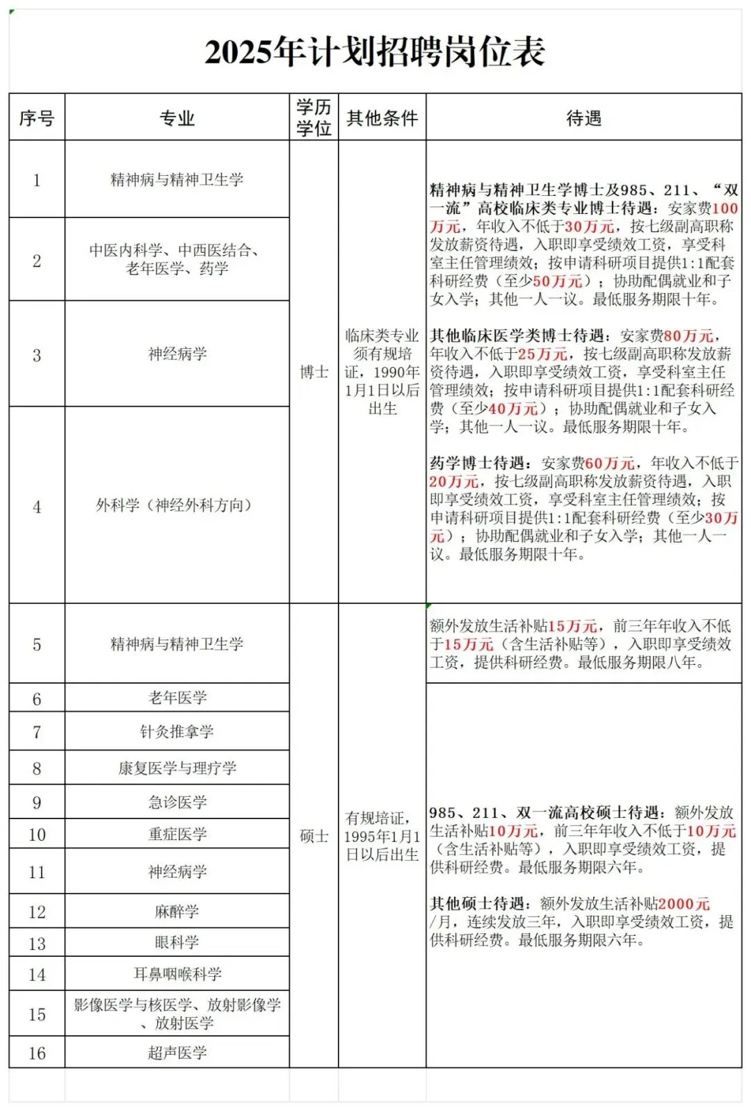精神病与精神卫生学博士及985、211、“双一流”高校临床医学类专业博士待遇:安家费100万元,年收入不低于30万元,按七级副高职称发放薪资待遇,入职即享受绩效工资,享受科室主任管理绩效;按申请科研项目提供1:1配套科研经费(至少50万元);协助配偶就业和子女入学;其他一人一议。最低服务期限十年。