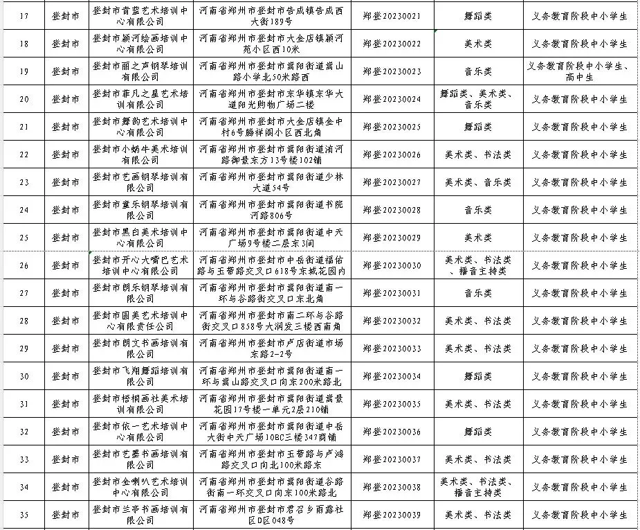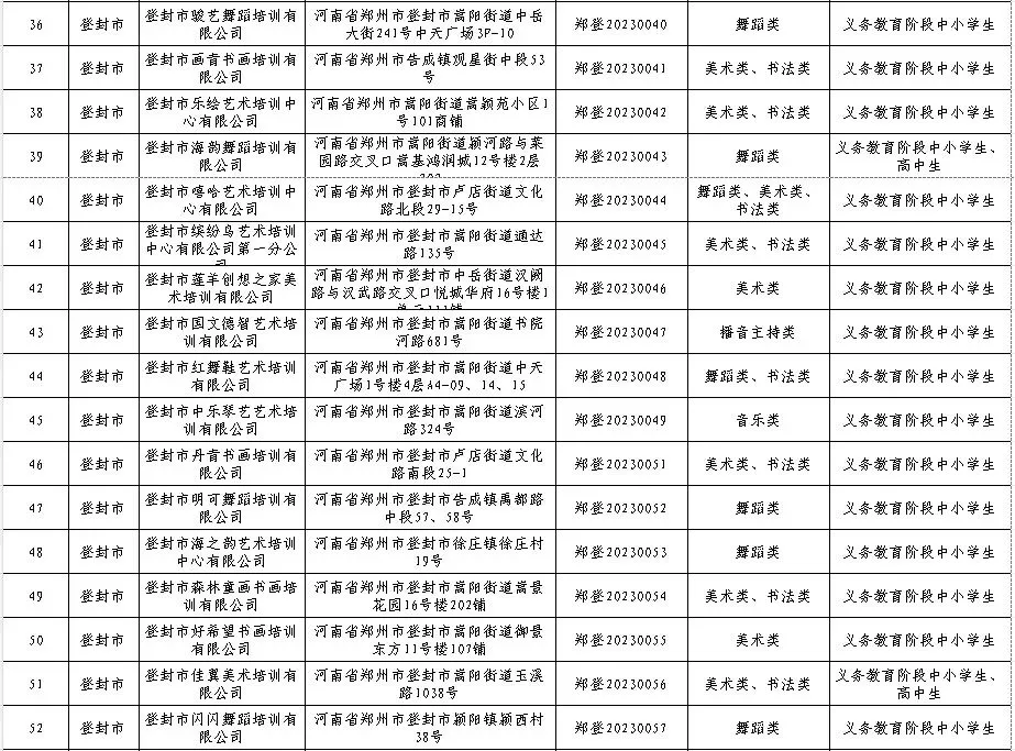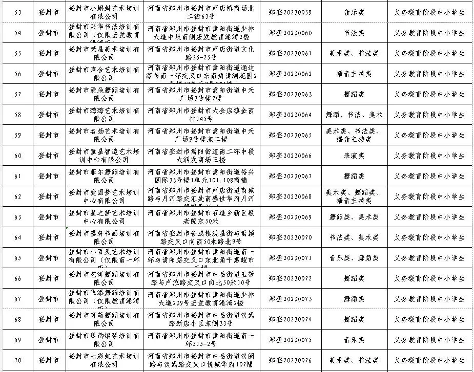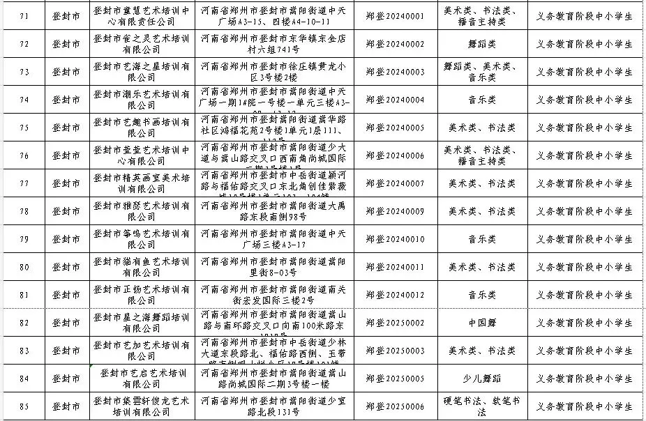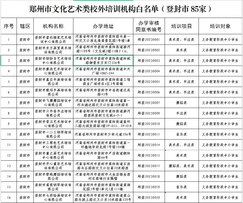 2026年寒假将至,广大中小学生文化艺术类校外培训需求增大,为严格落实国家“双减”政策,根据《河南省文化艺术类校外培训设置和管理指南》和《郑州市文化艺术类校外培训机构监督管理实施方案(试行)》的通知要求,经各开发区、区县(市)文化广电和旅游主管部门审核同意,郑州市目前共有1267家文化艺术类校外培训白名单机构,其中登封85家,现予以公布,供广大家长学生进行选择。